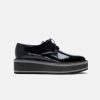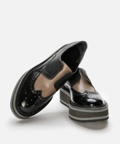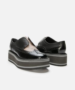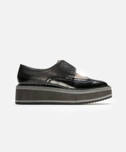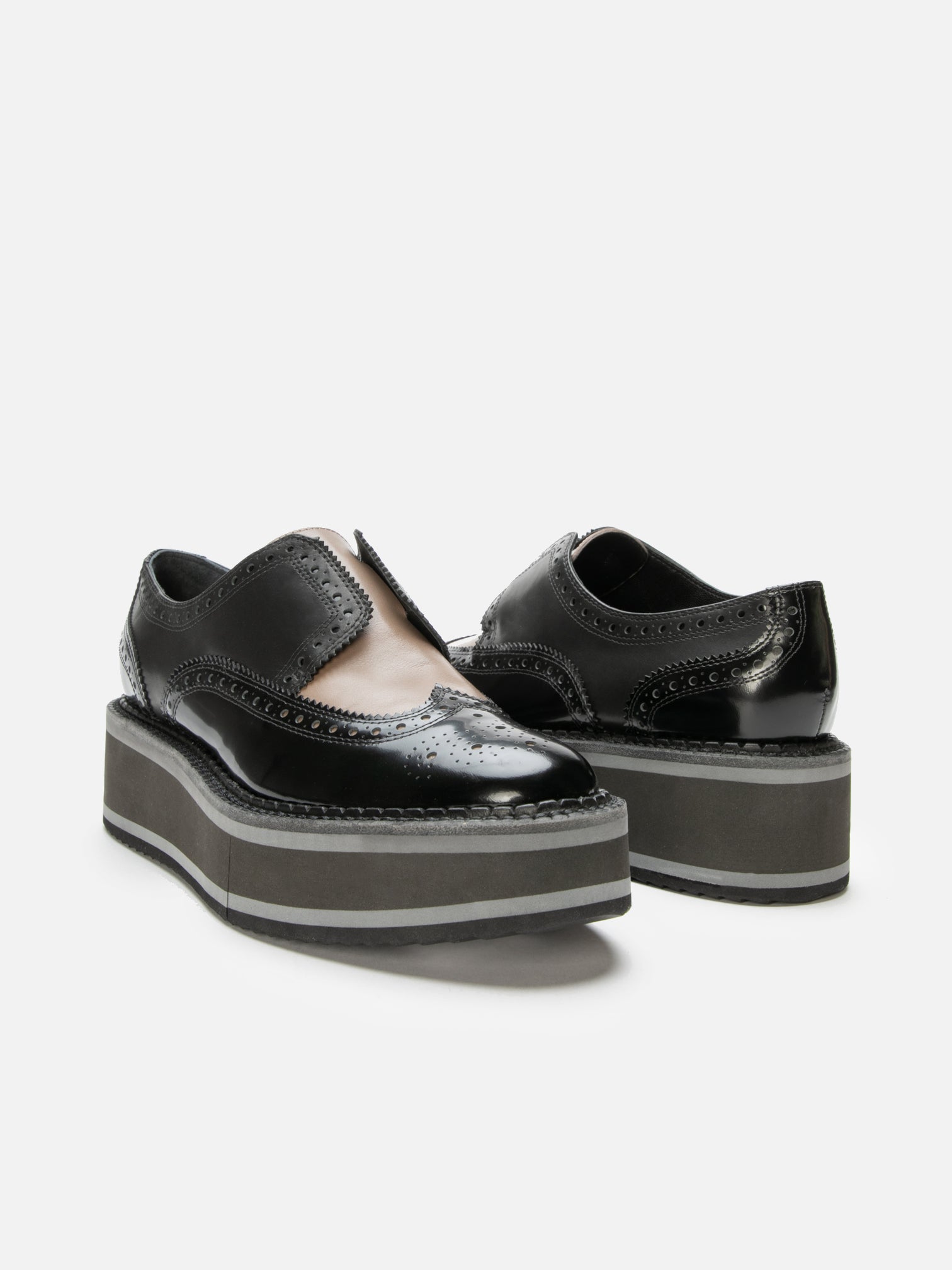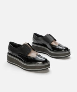Upper: black glossed calfskin, stone smooth calfskin, black smooth calfskin / Lining: black goatskin lining / Sole: black welt, anthracite EVA flatform, black sole