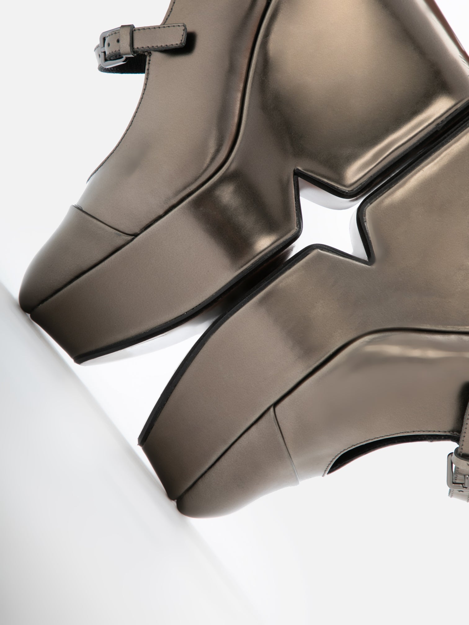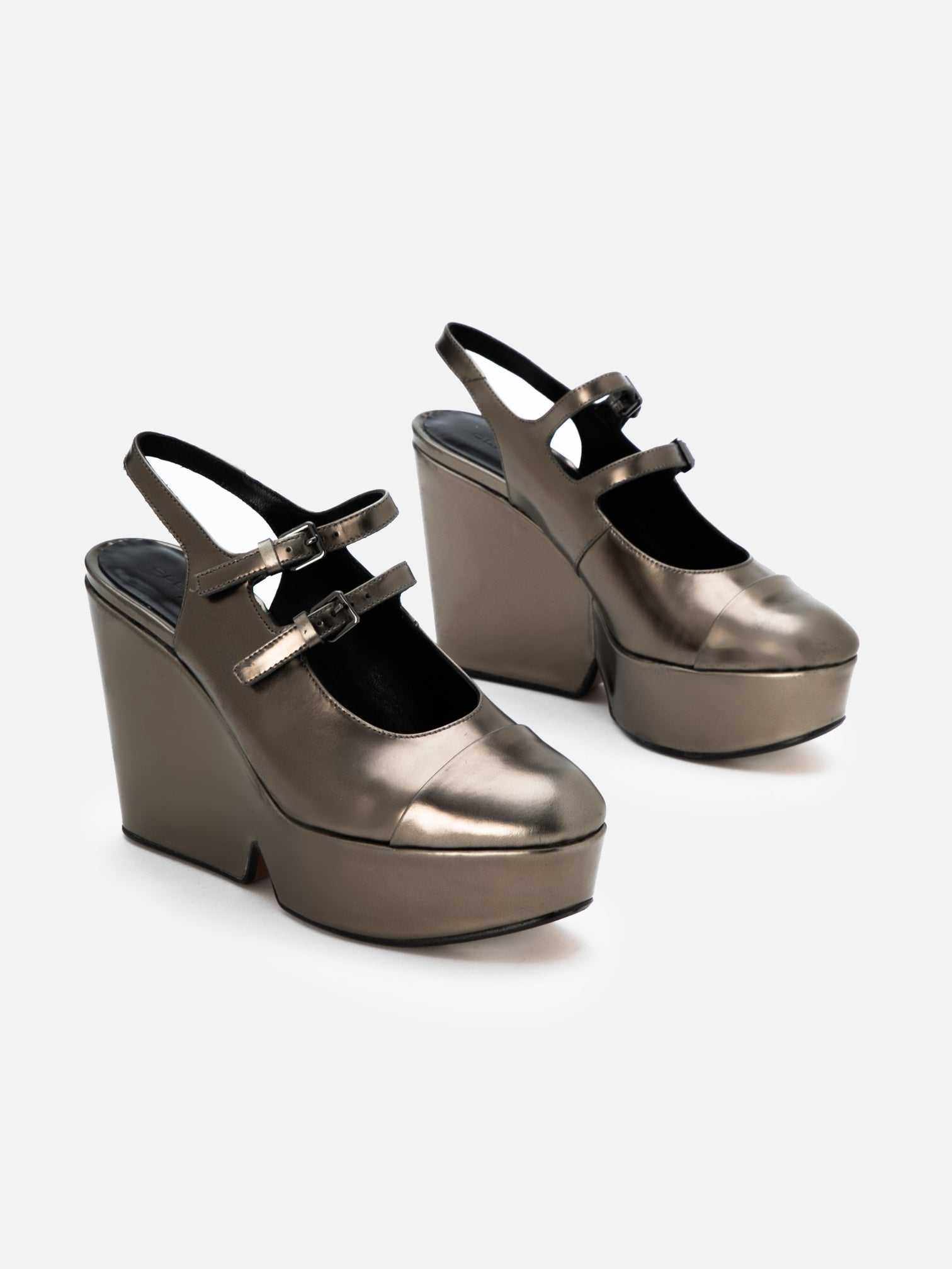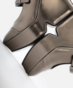 Upper: Gobi metallic glossed calfskin / Lining: Black goatskin / Sole: Gobi metallic glossed calfskin covered platform, arizona sole, black edge