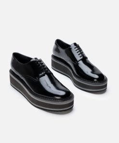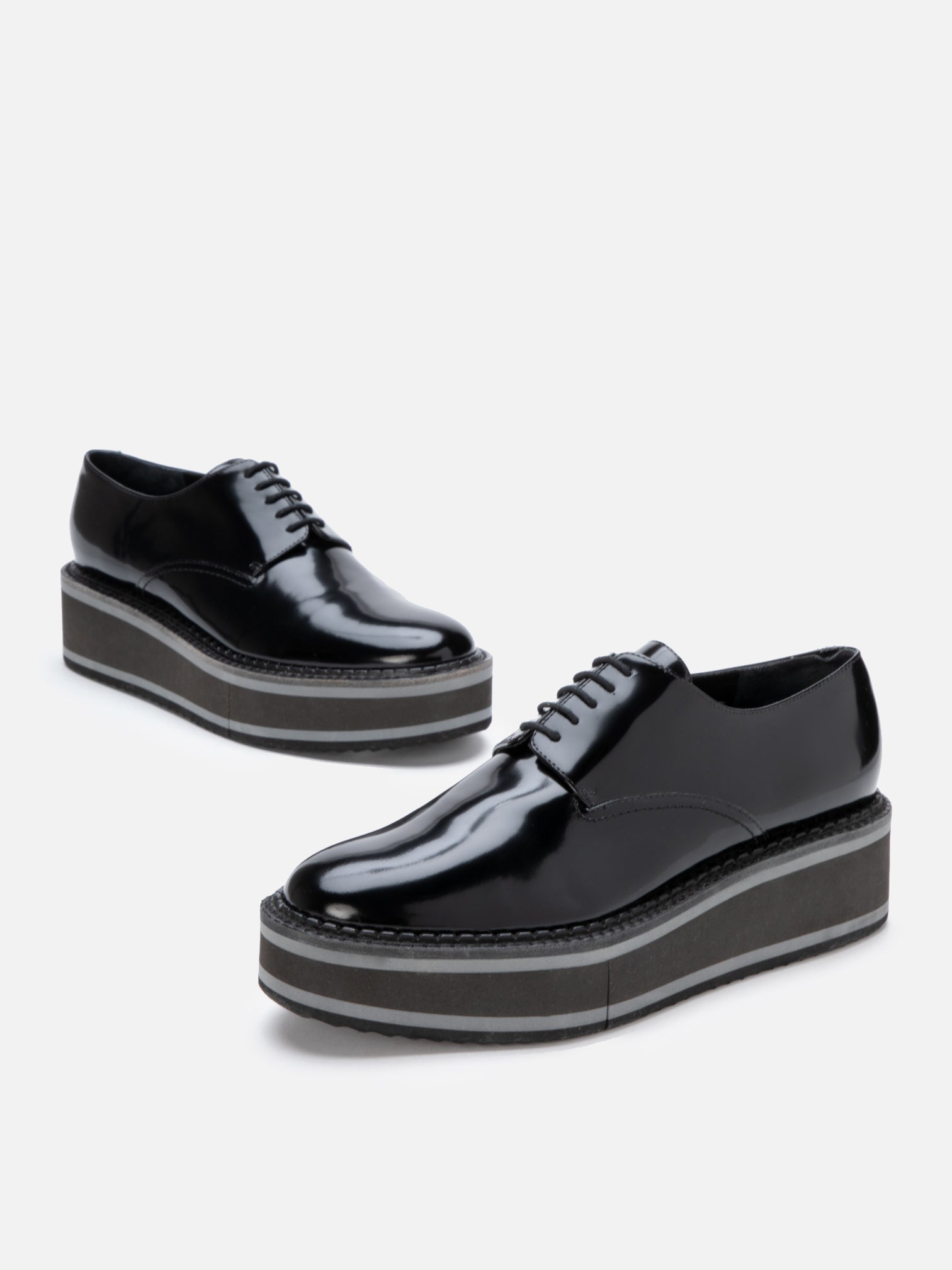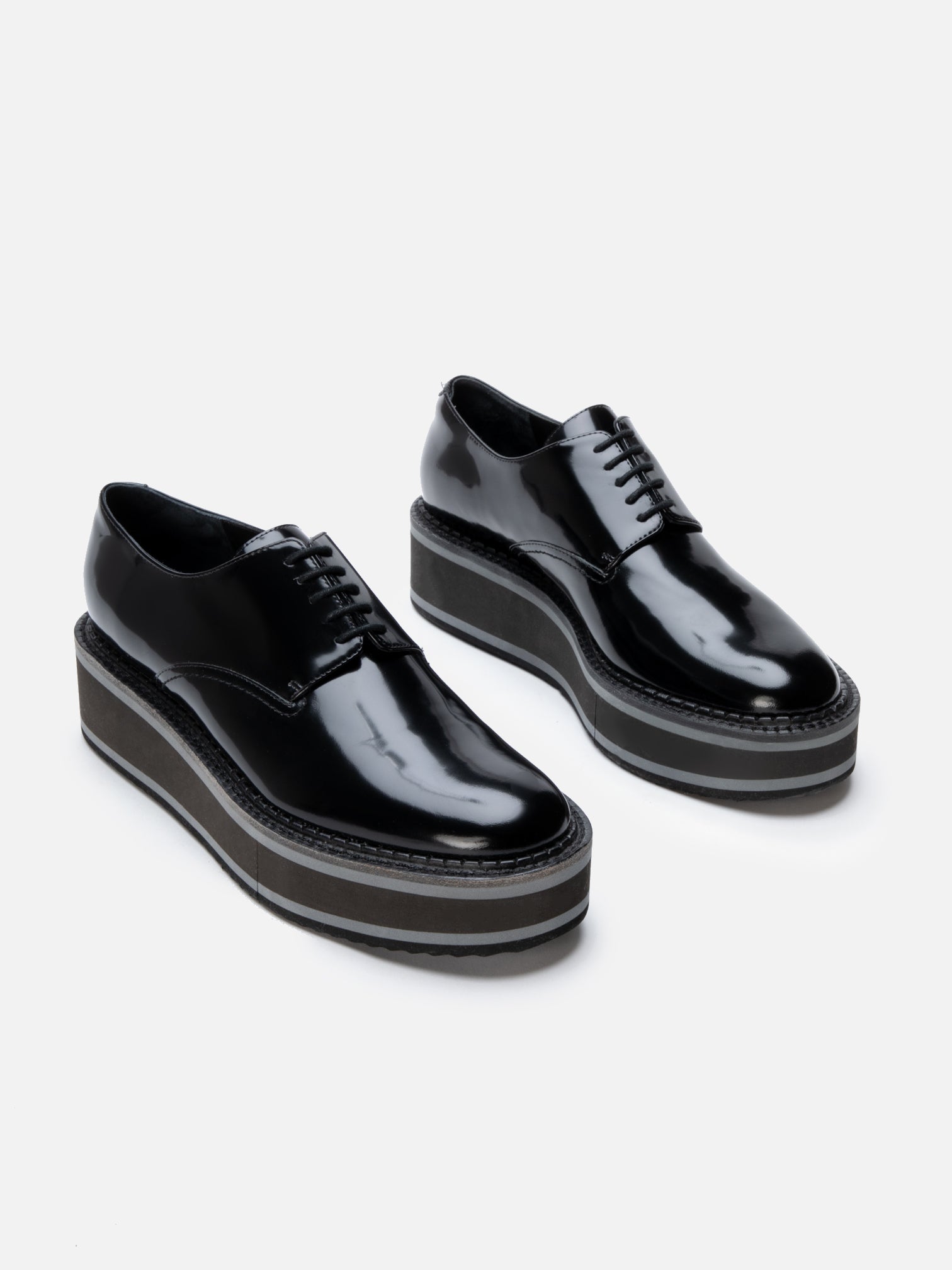 Upper: black glossed calfskin / Lining: black goatskin lining / Sole: black welt, anthracite EVA flatform, black sole