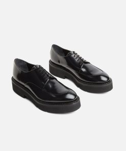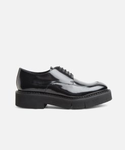 Upper: black glossed calfskin / Lining: black goatskin lining / Sole: black welt, black EVA flatform, anthracite sole