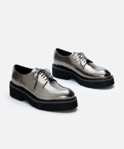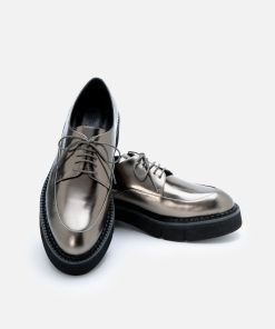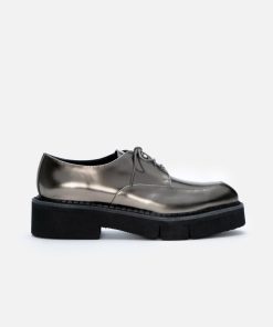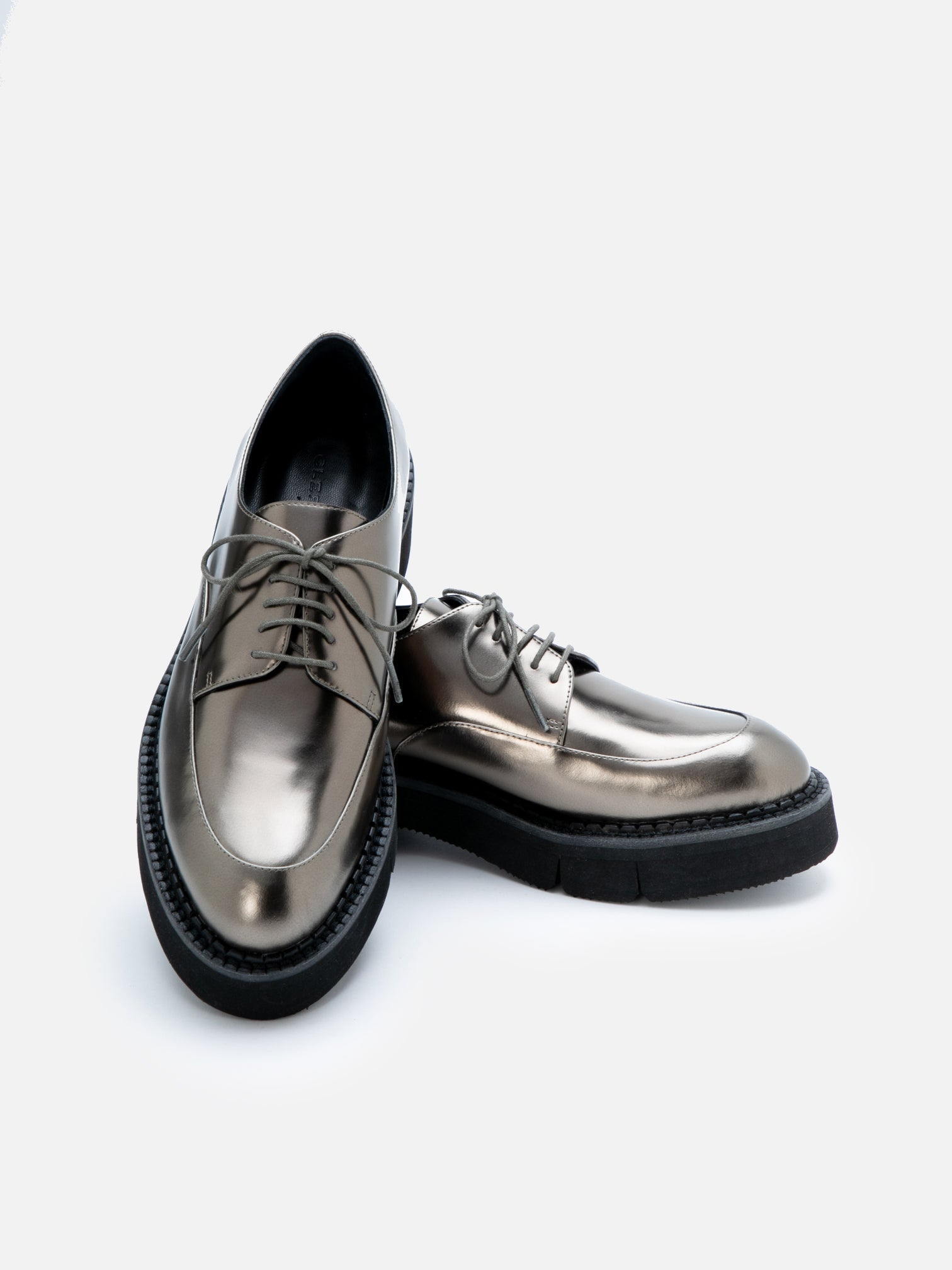 Upper: gobi metallic glossed calfskin / Lining: black goatskin lining / Sole: black welt, black EVA flatform, anthracite sole