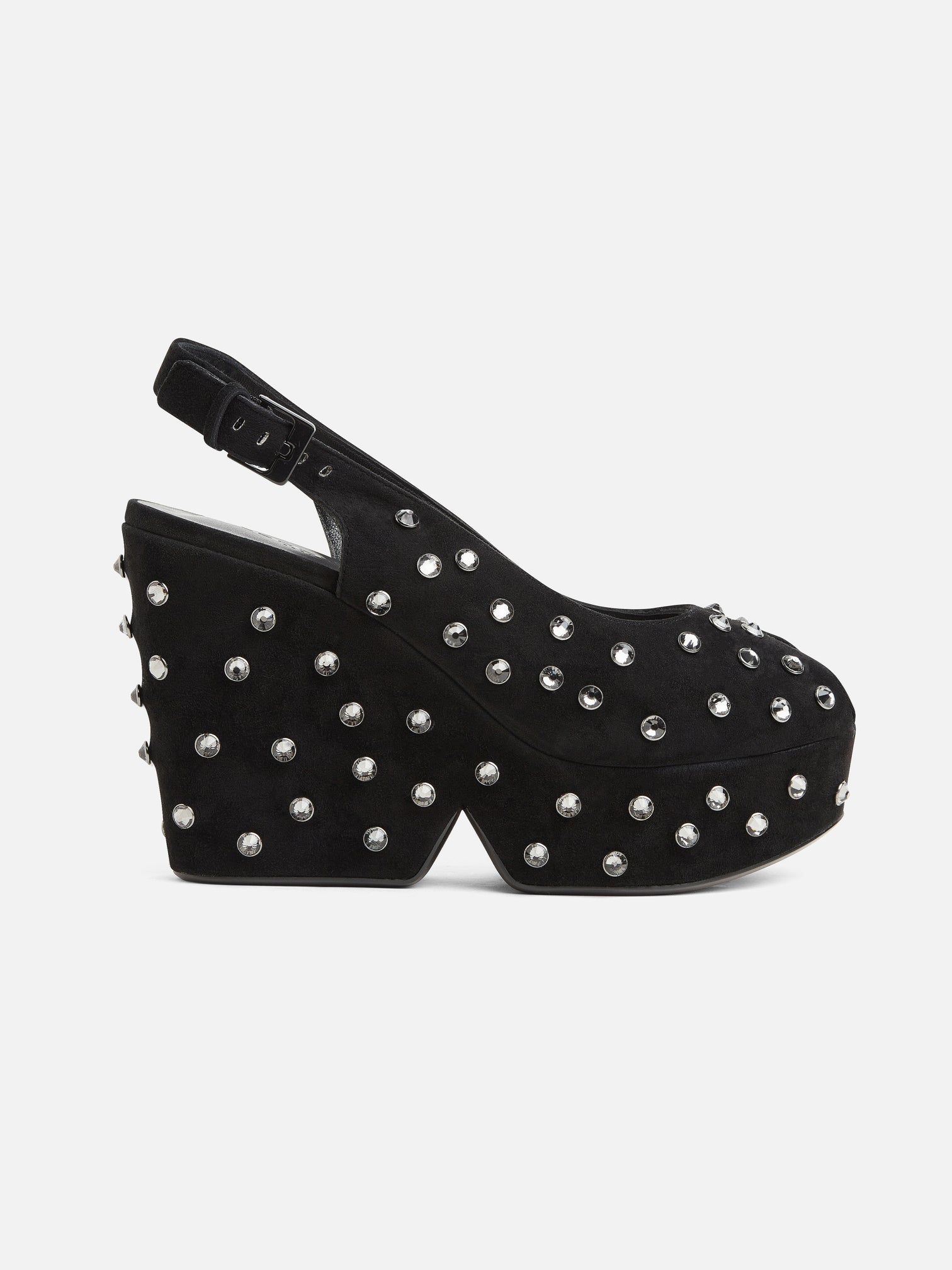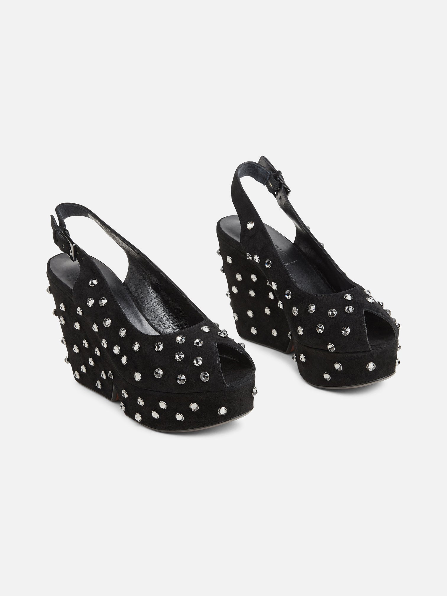 Upper: black suede goatskin, black rhinestones / Lining: black goatskin lining / Sole: black suede goatskin/black rhinestones covered platform, arizona sole, black edge