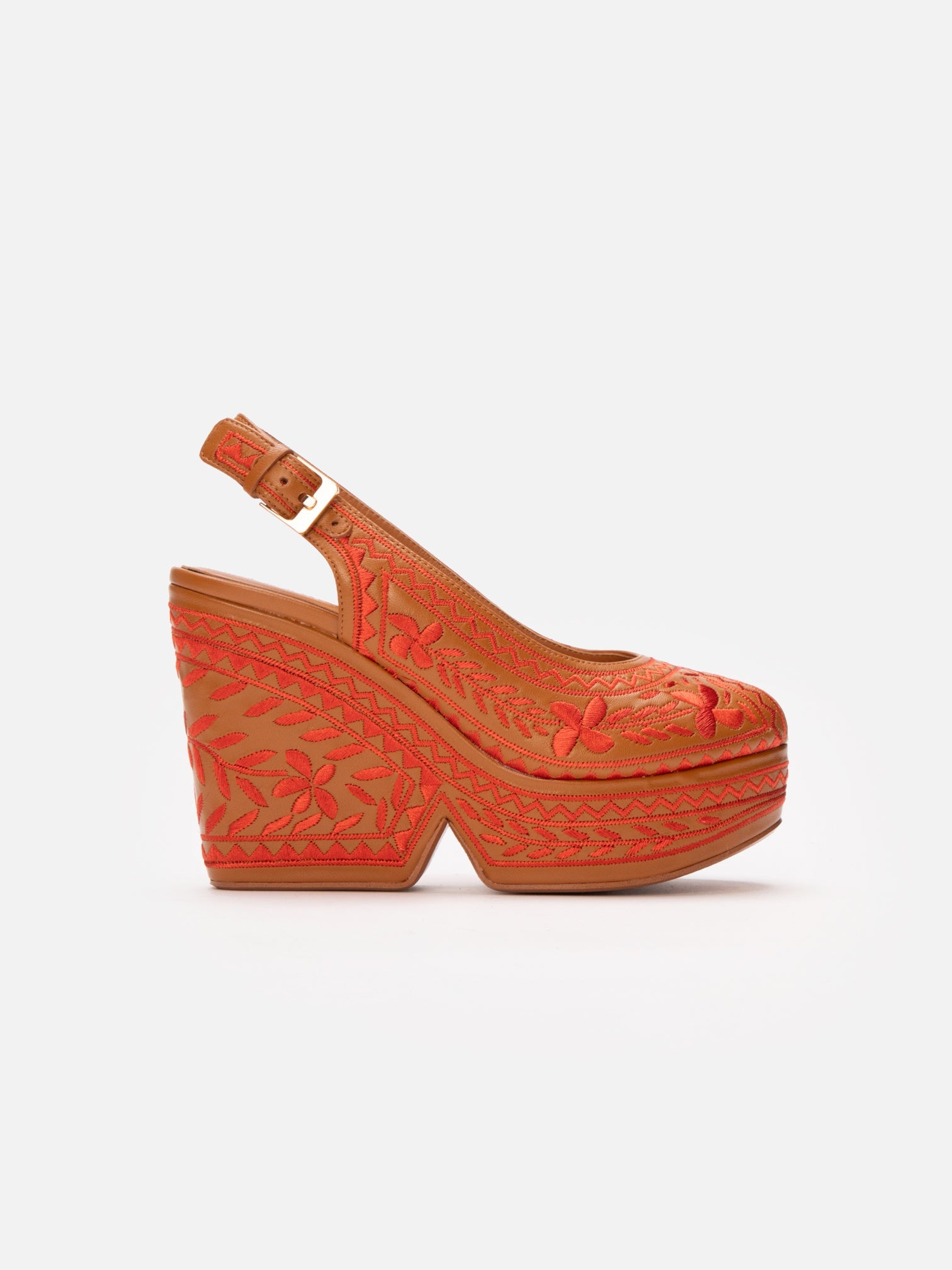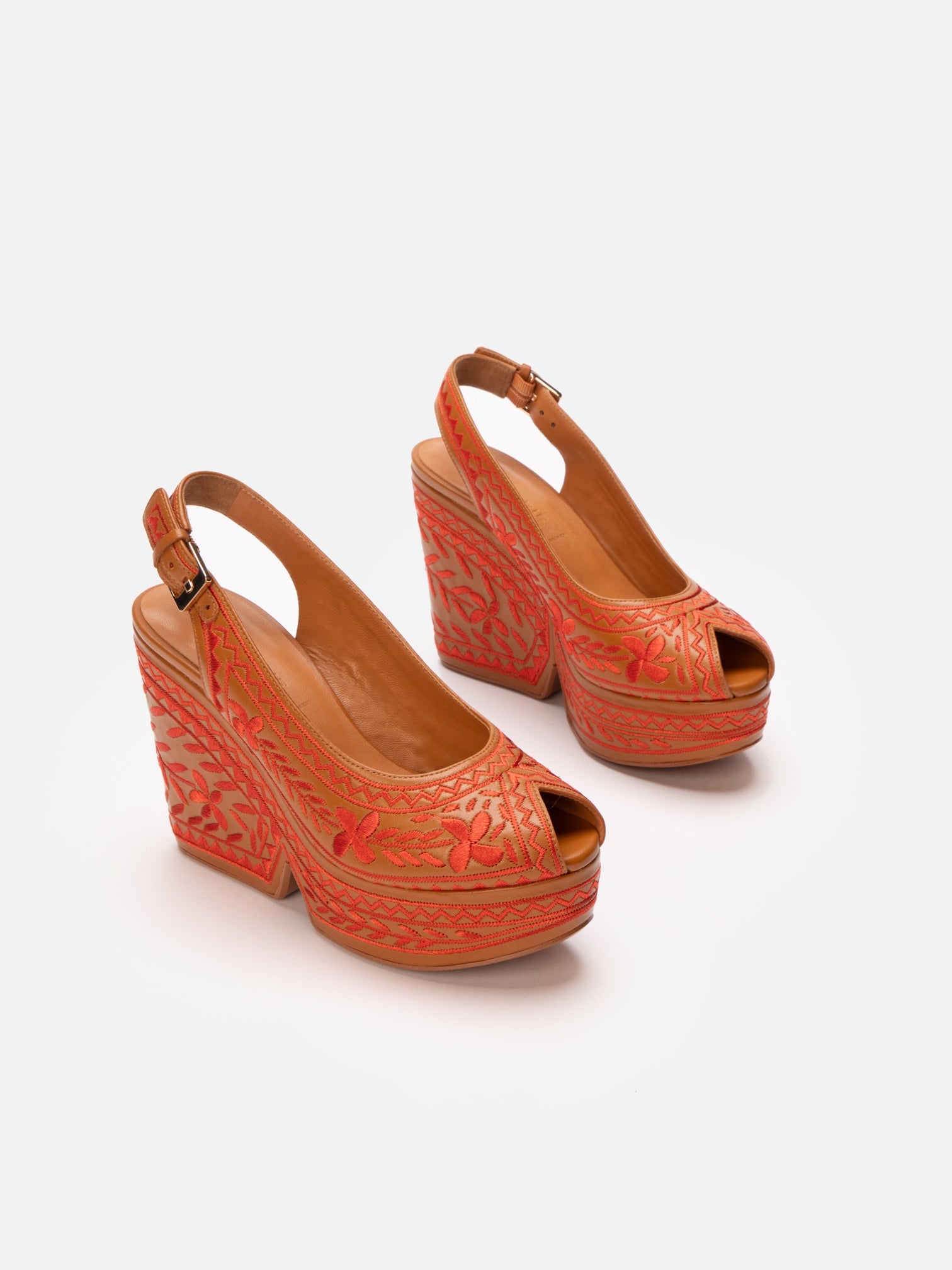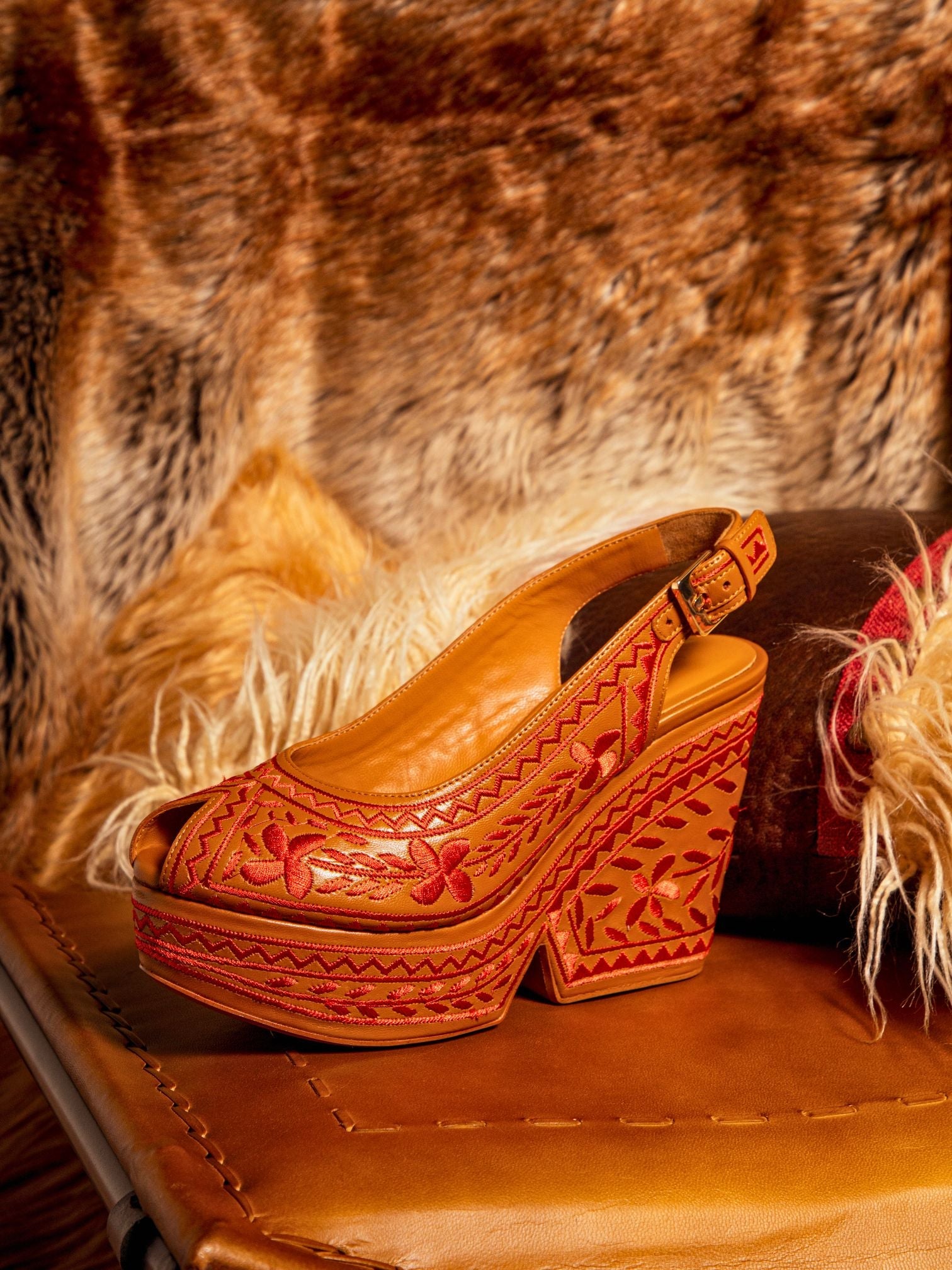 Upper: bush lambskin, spice embroidery / Lining: gold goatskin lining / Sole: bush lambskin/spice embroidery covered platform, arizona sole, natural edge