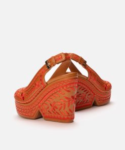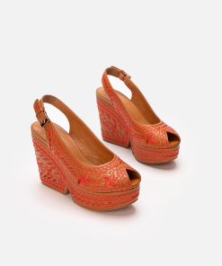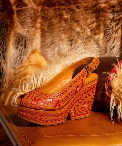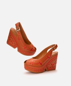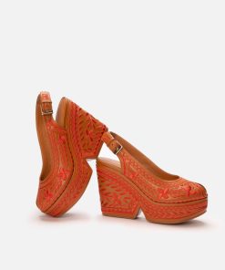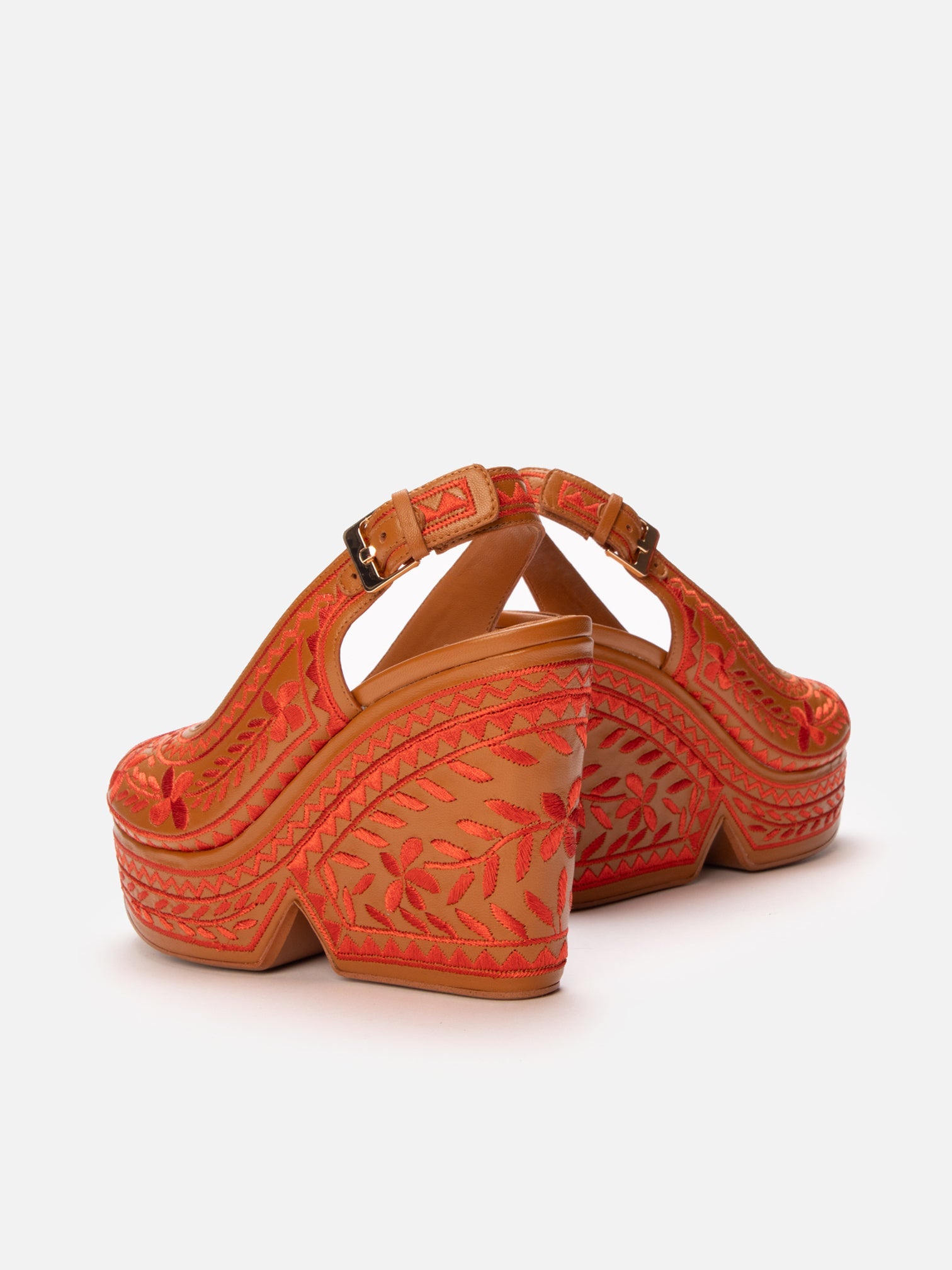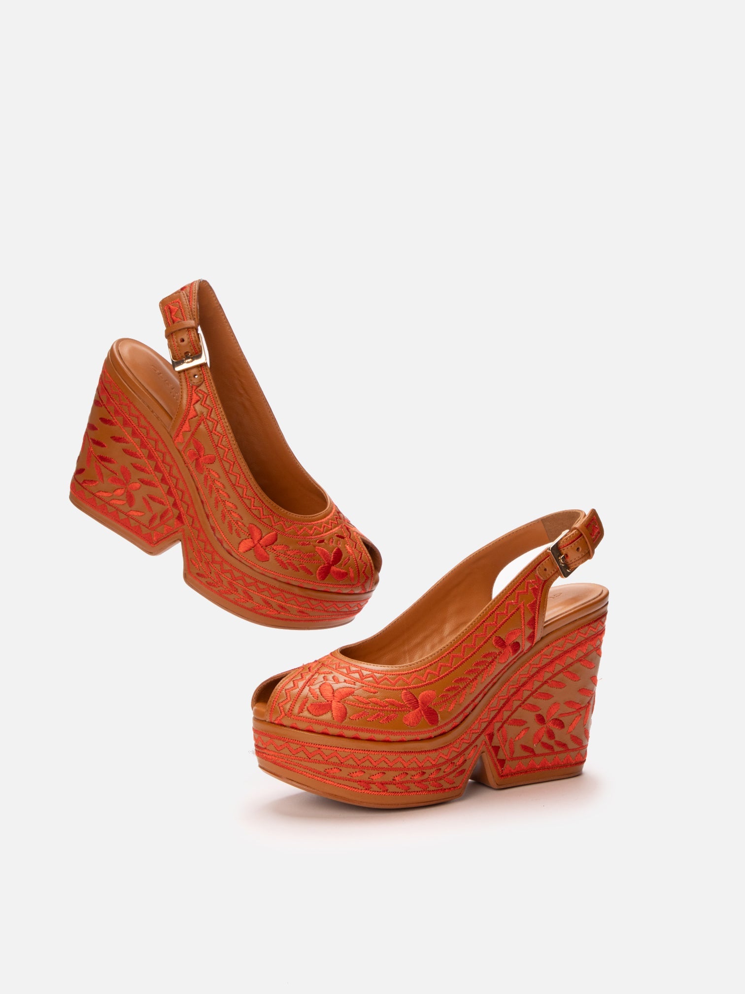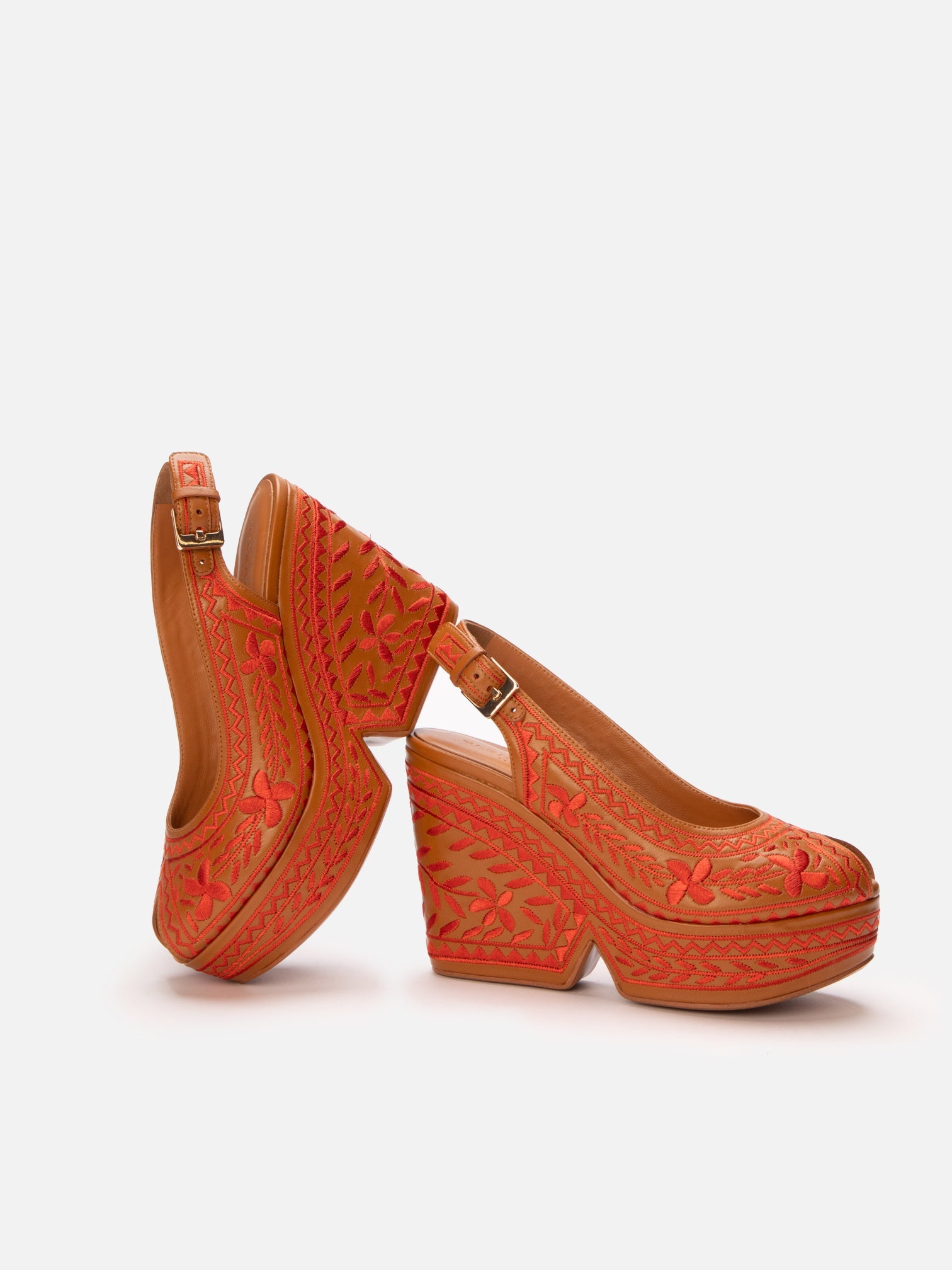 Upper: bush lambskin, spice embroidery / Lining: gold goatskin lining / Sole: bush lambskin/spice embroidery covered platform, arizona sole, natural edge