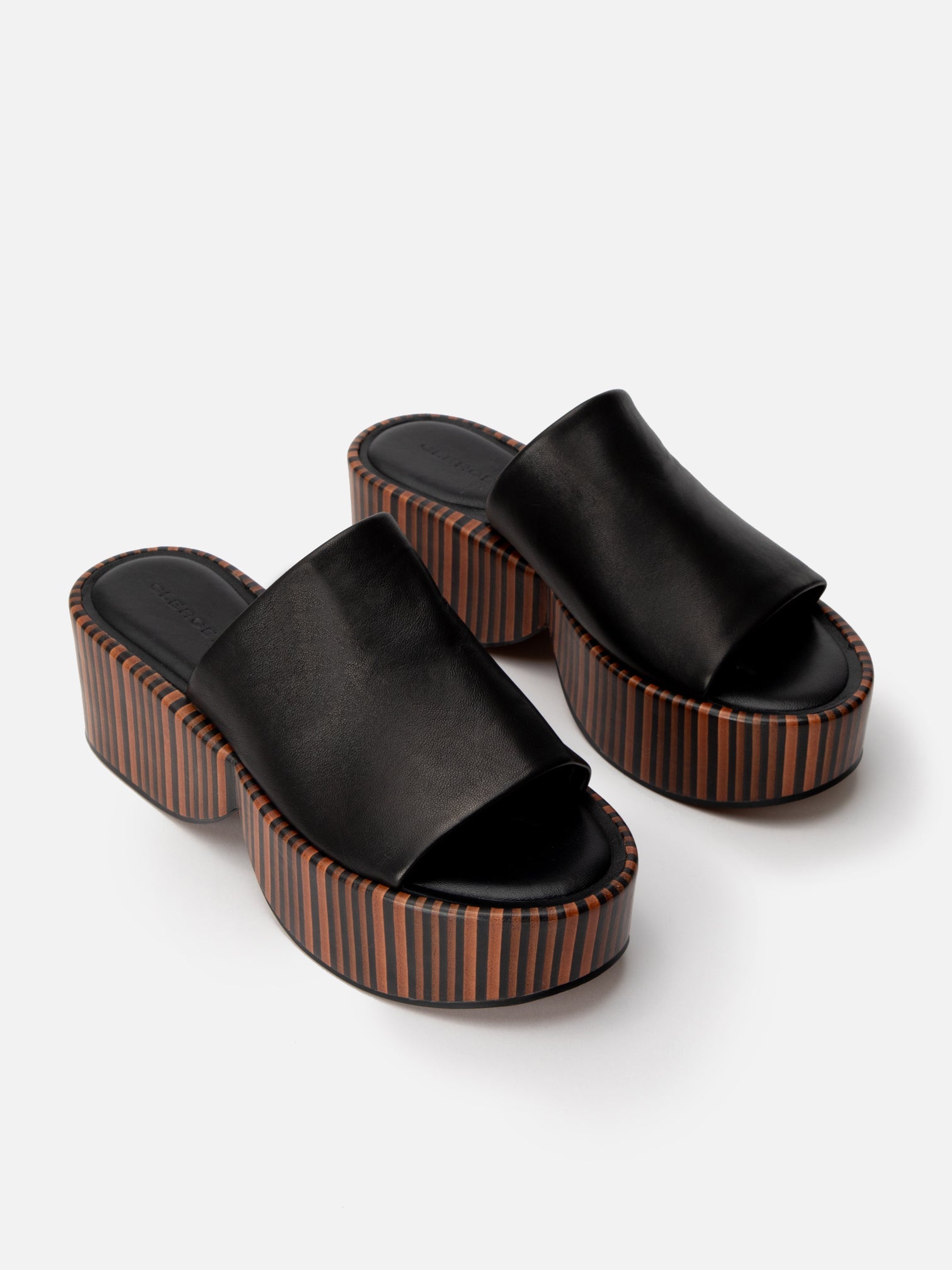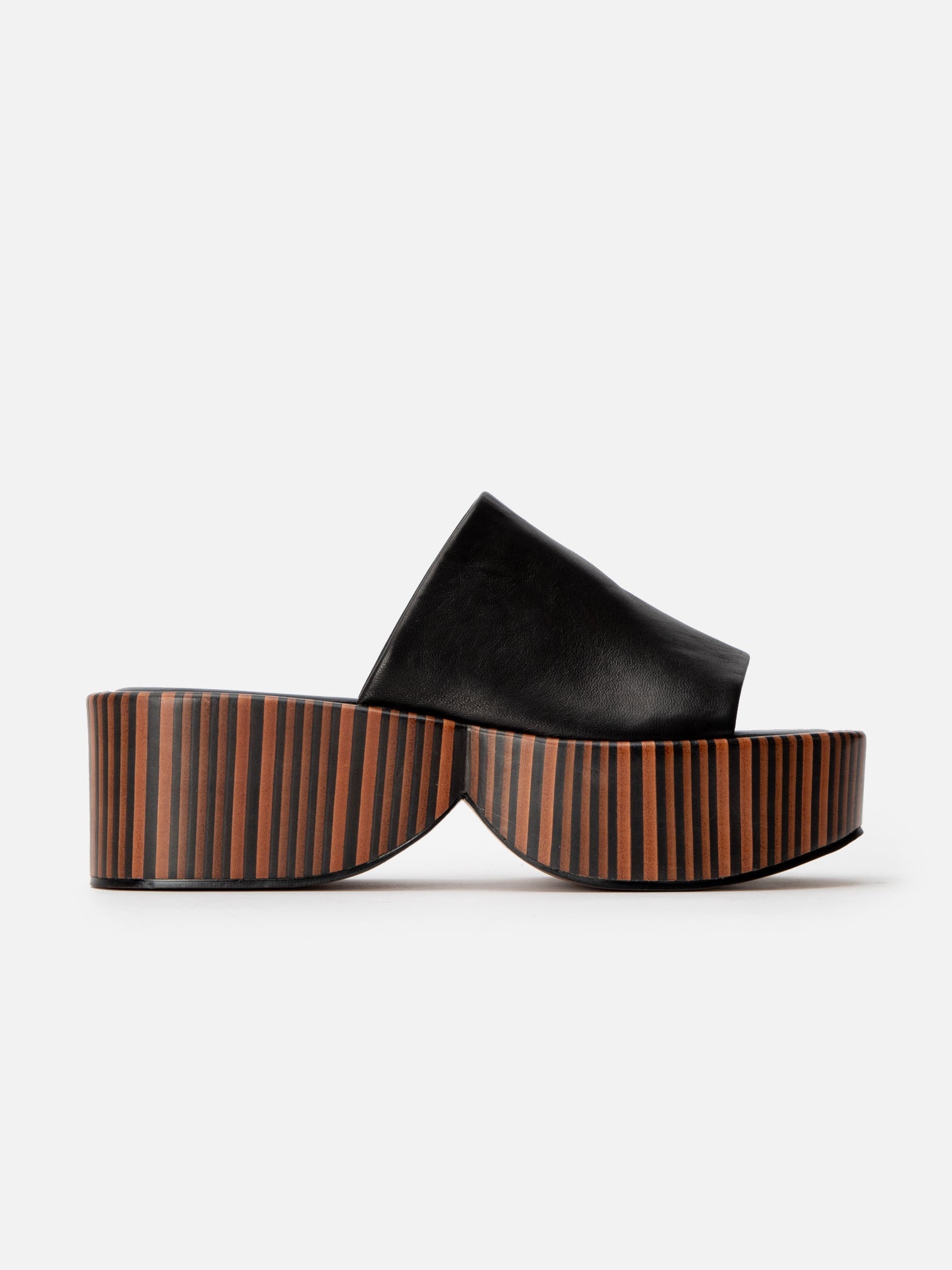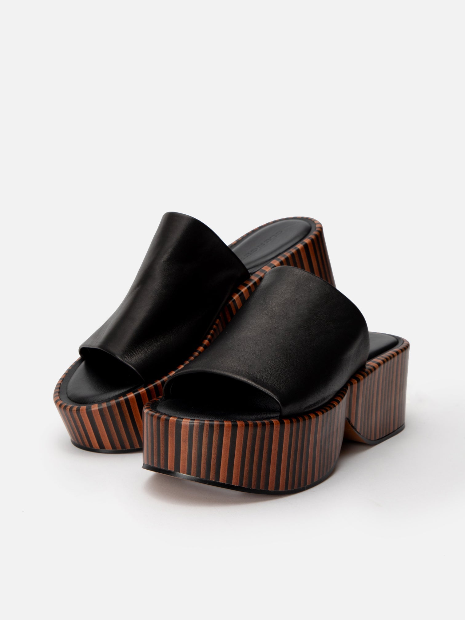 Upper: Black lambskin / Lining: Black crust lambskin / Sole: Dark brown and black stacked leather platform, arizona sole, black edge
