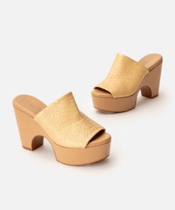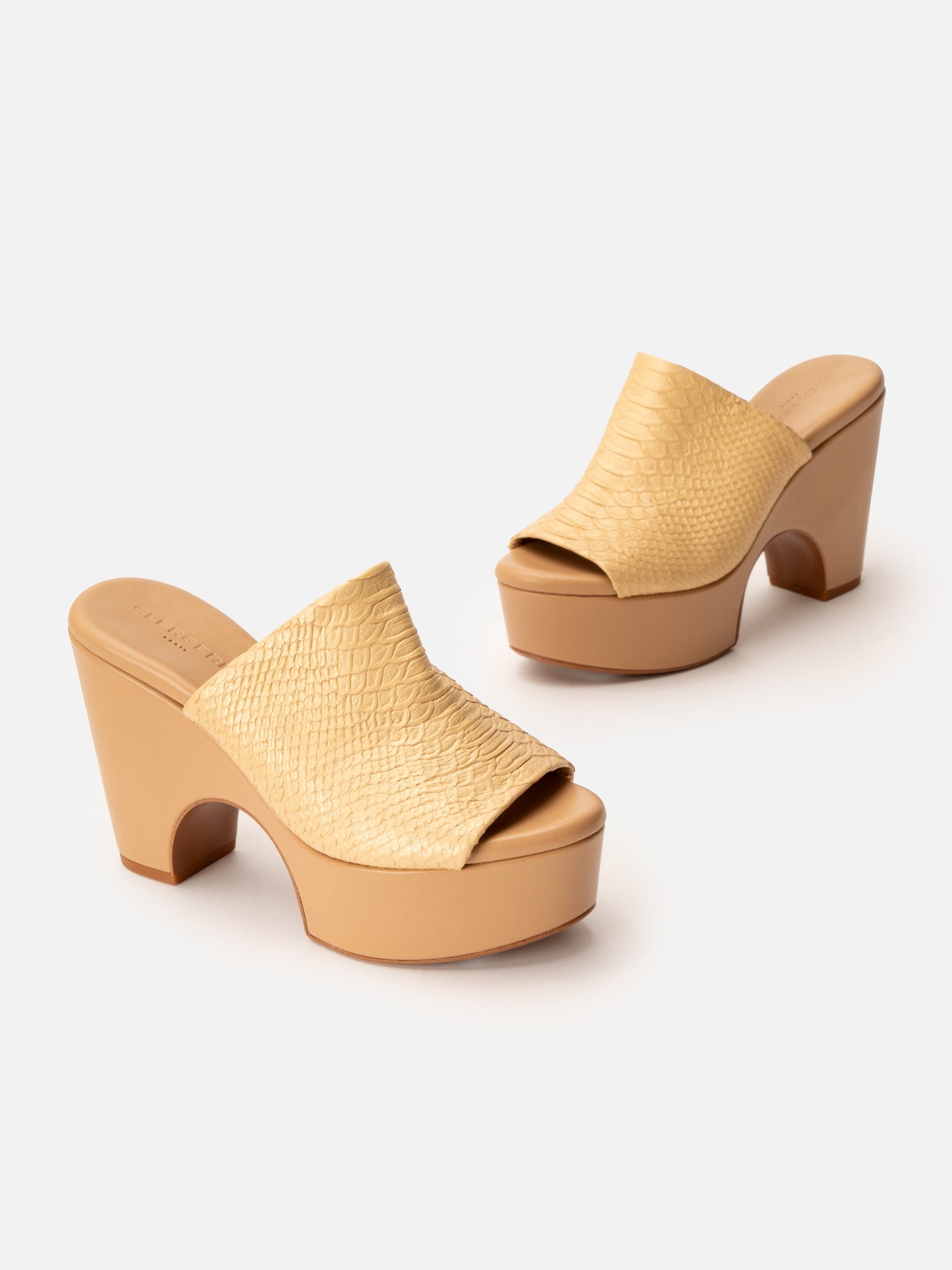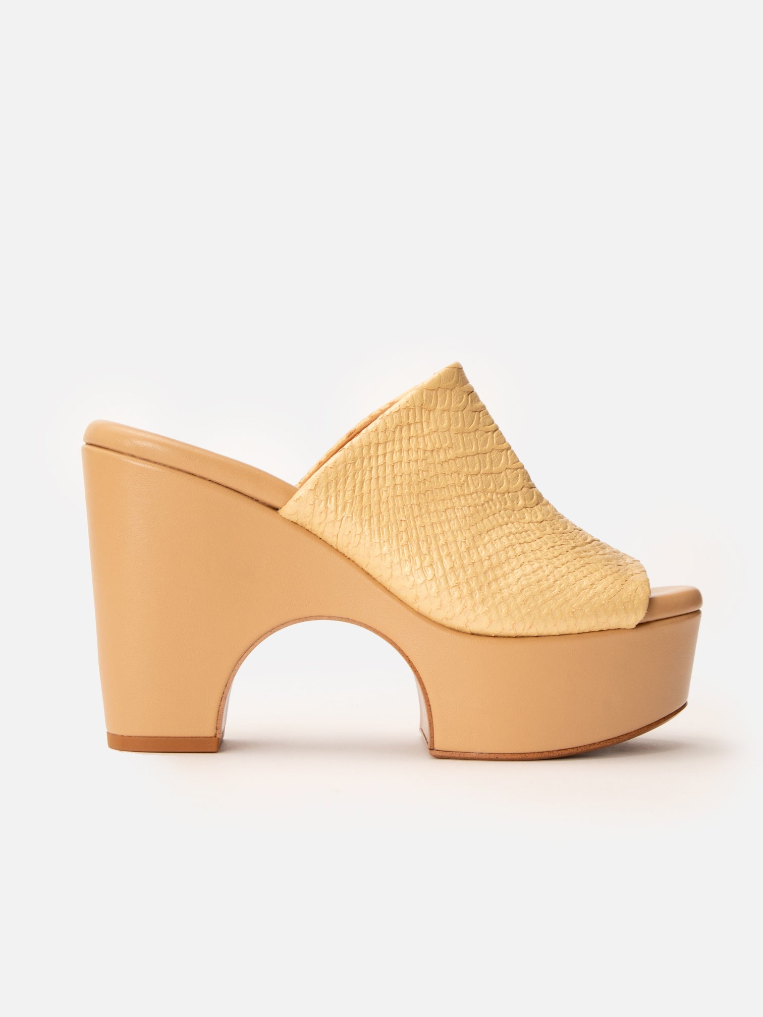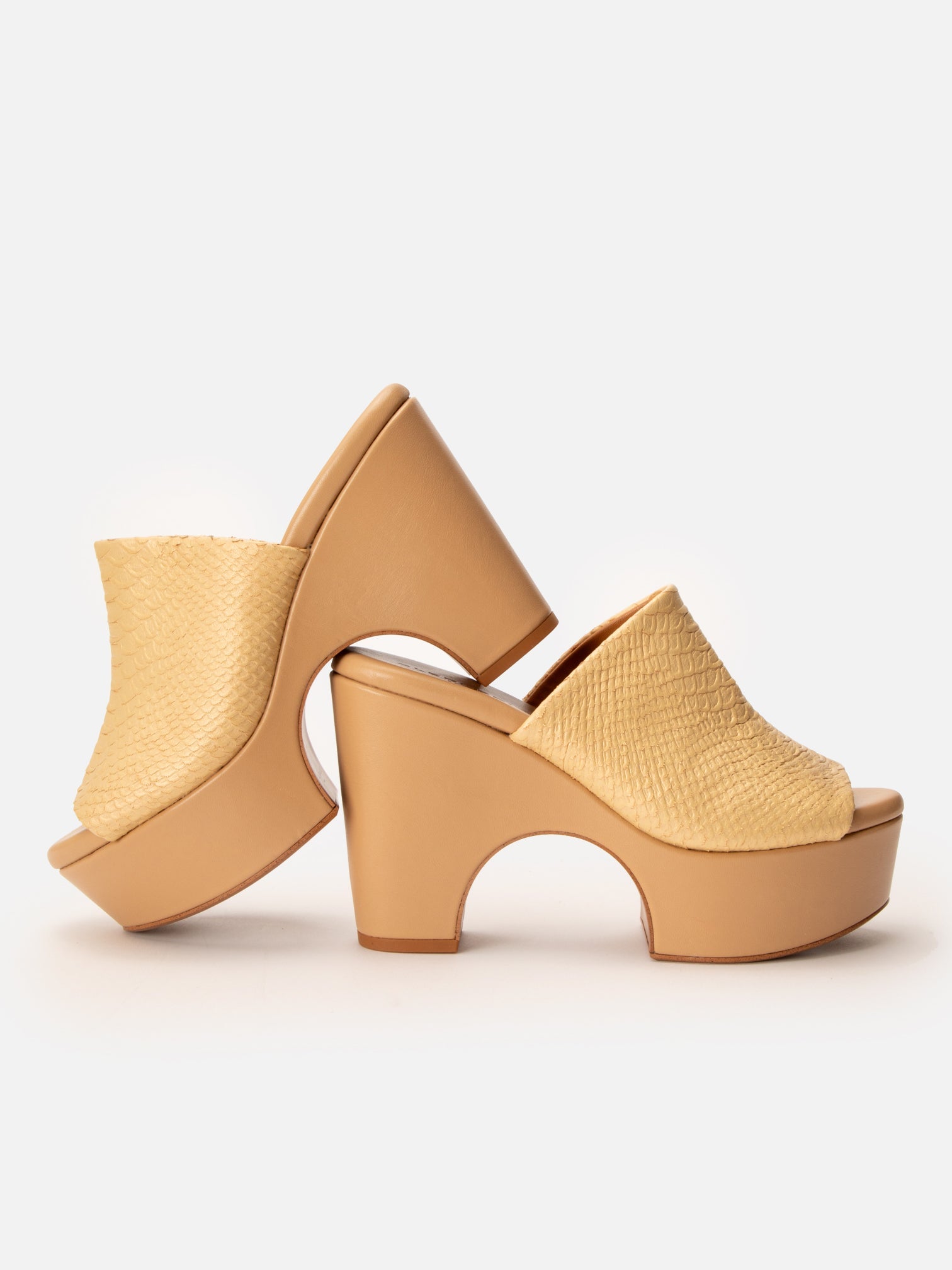 Upper: Nude snake effect iridescent lambskin / Lining: Gold goatskin/ Sole: Nude lambskin covered platform, arizona sole, natural edge