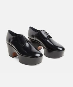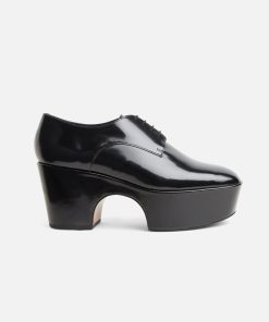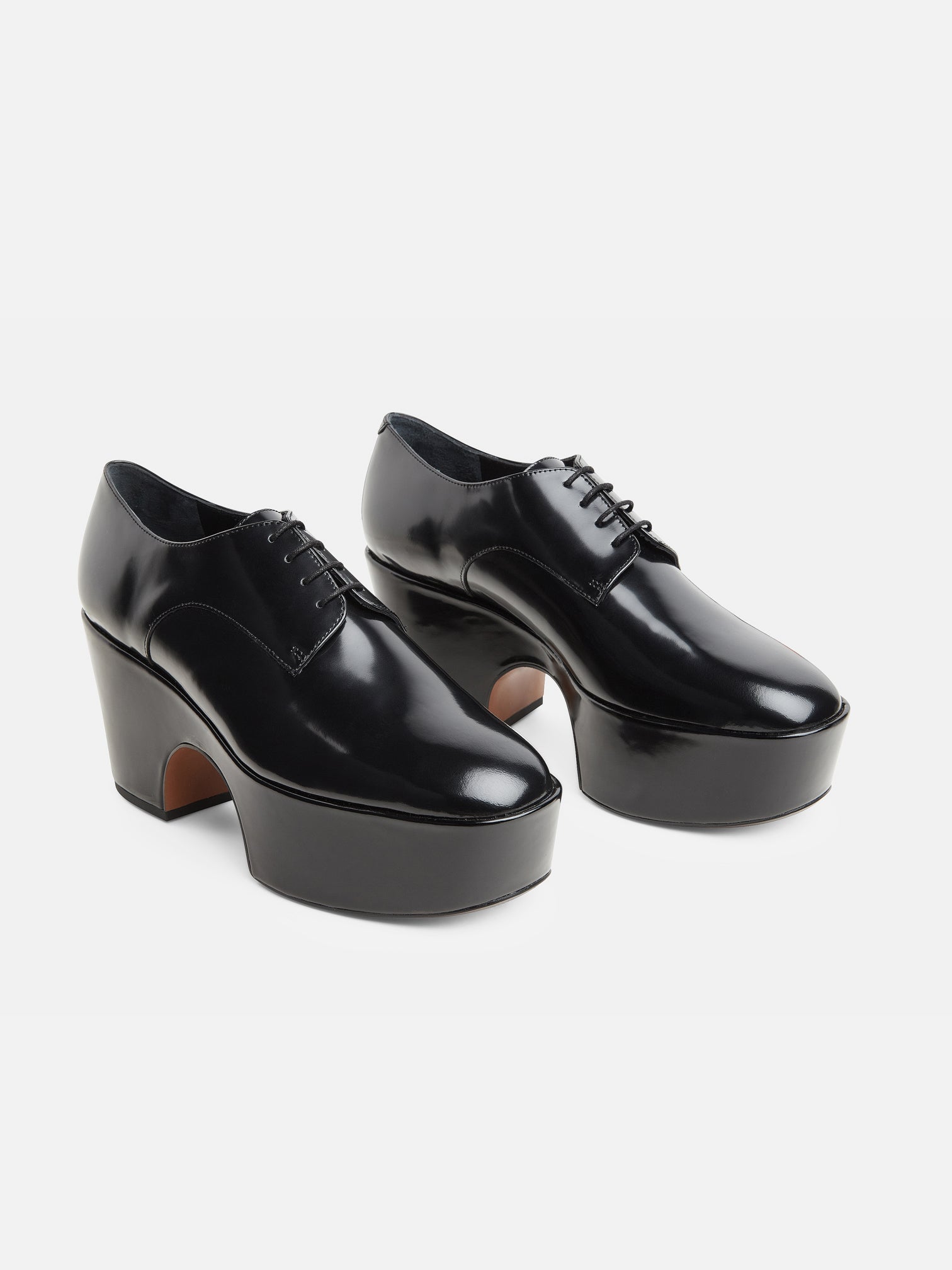 Upper: black glossed calfskin / Lining: black goatskin lining / Sole: black glossed calfskin covered platform, amber leather sole, black edge