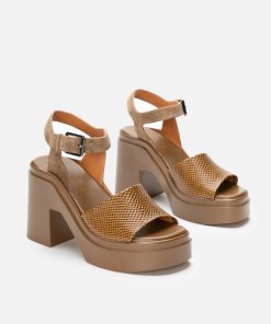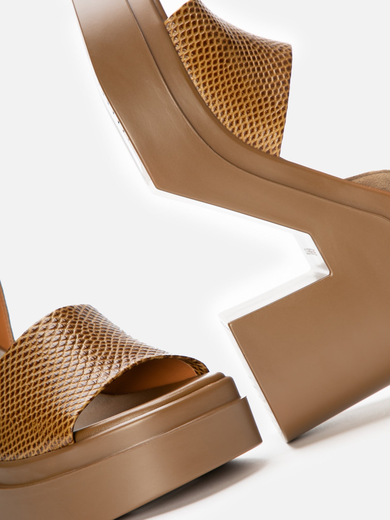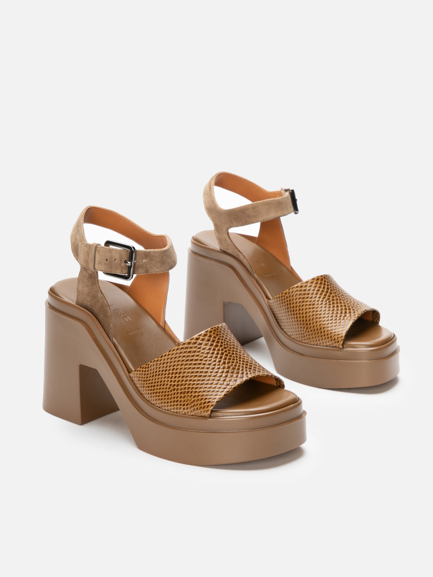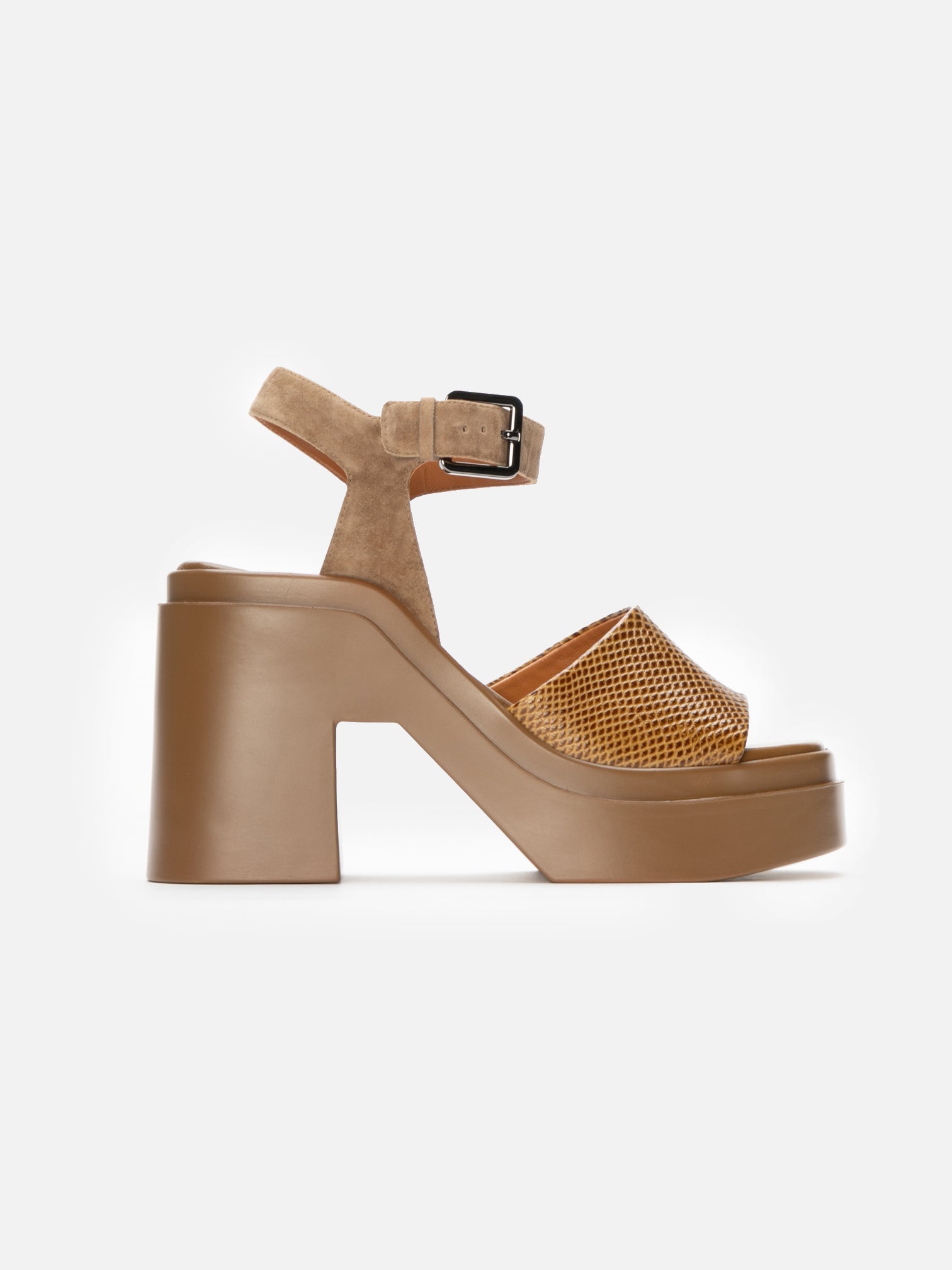 Upper: gobi karung effect embossed calfskin, gobi suede goatskin / Lining: gold goatskin lining / Sole: gobi rubber platform