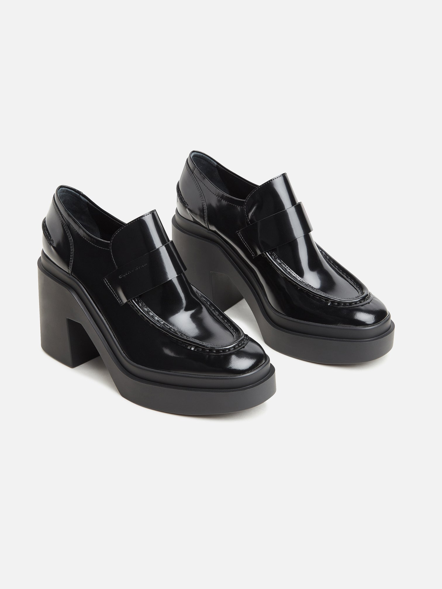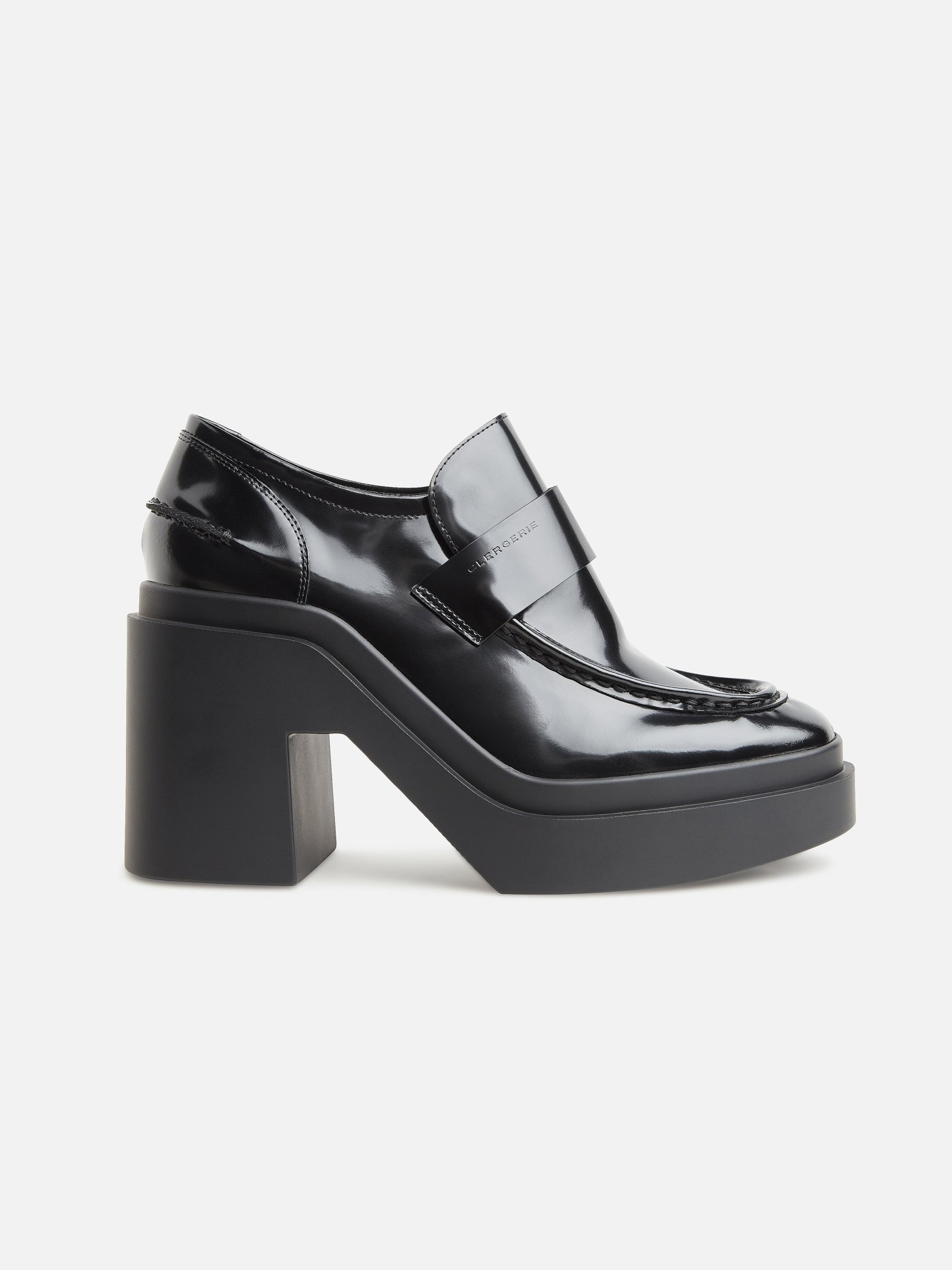 Upper: black glossed calfskin / Lining: black goatskin lining / Sole: black rubber platform