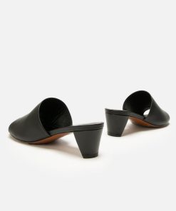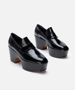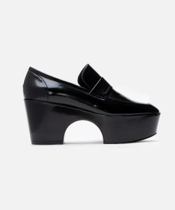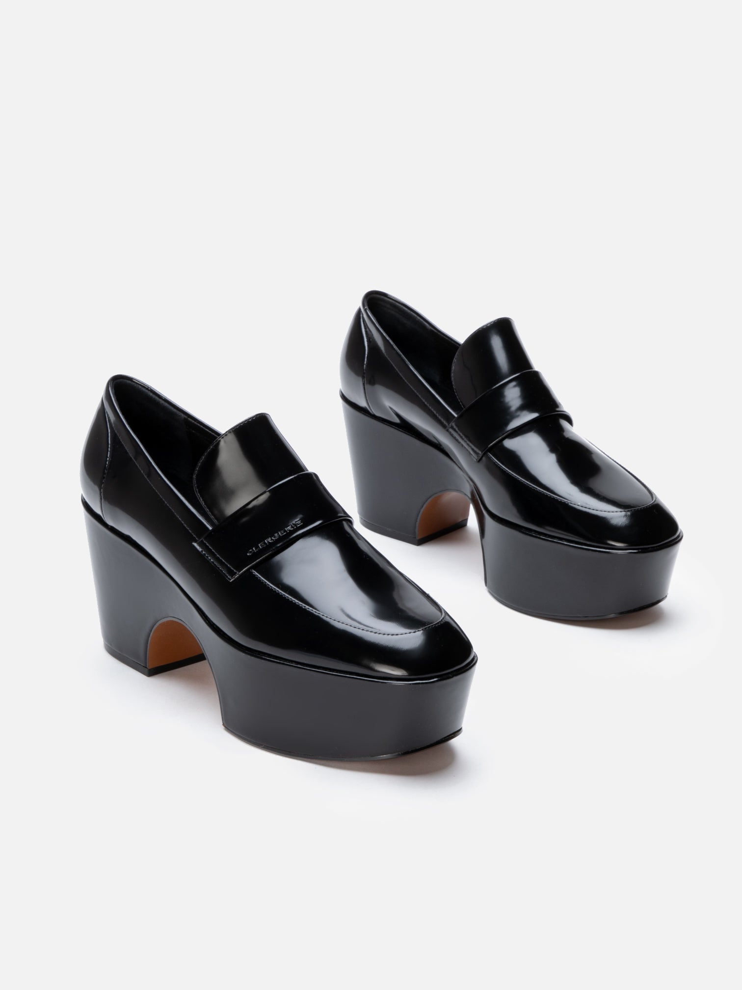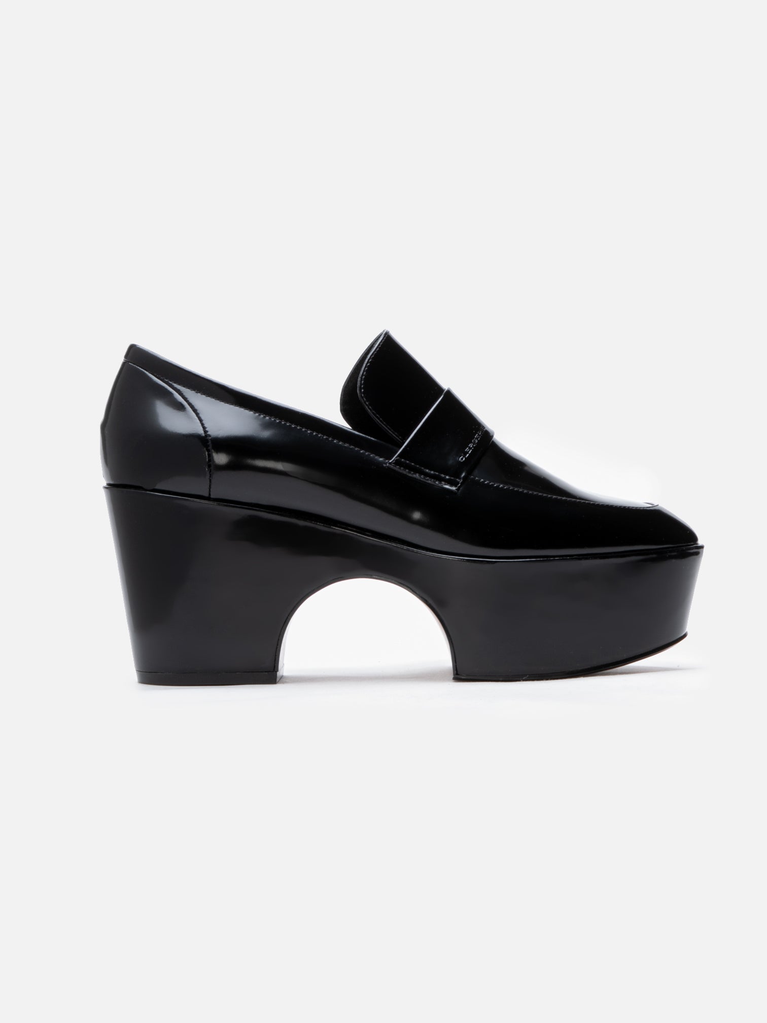 Upper: black glossed calfskin / Lining: black goatskin lining / Sole: black glossed calfskin covered platform, amber leather sole, black edge