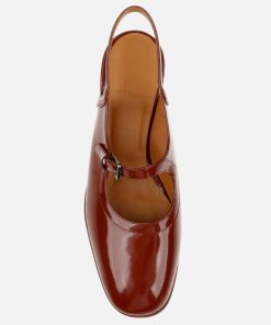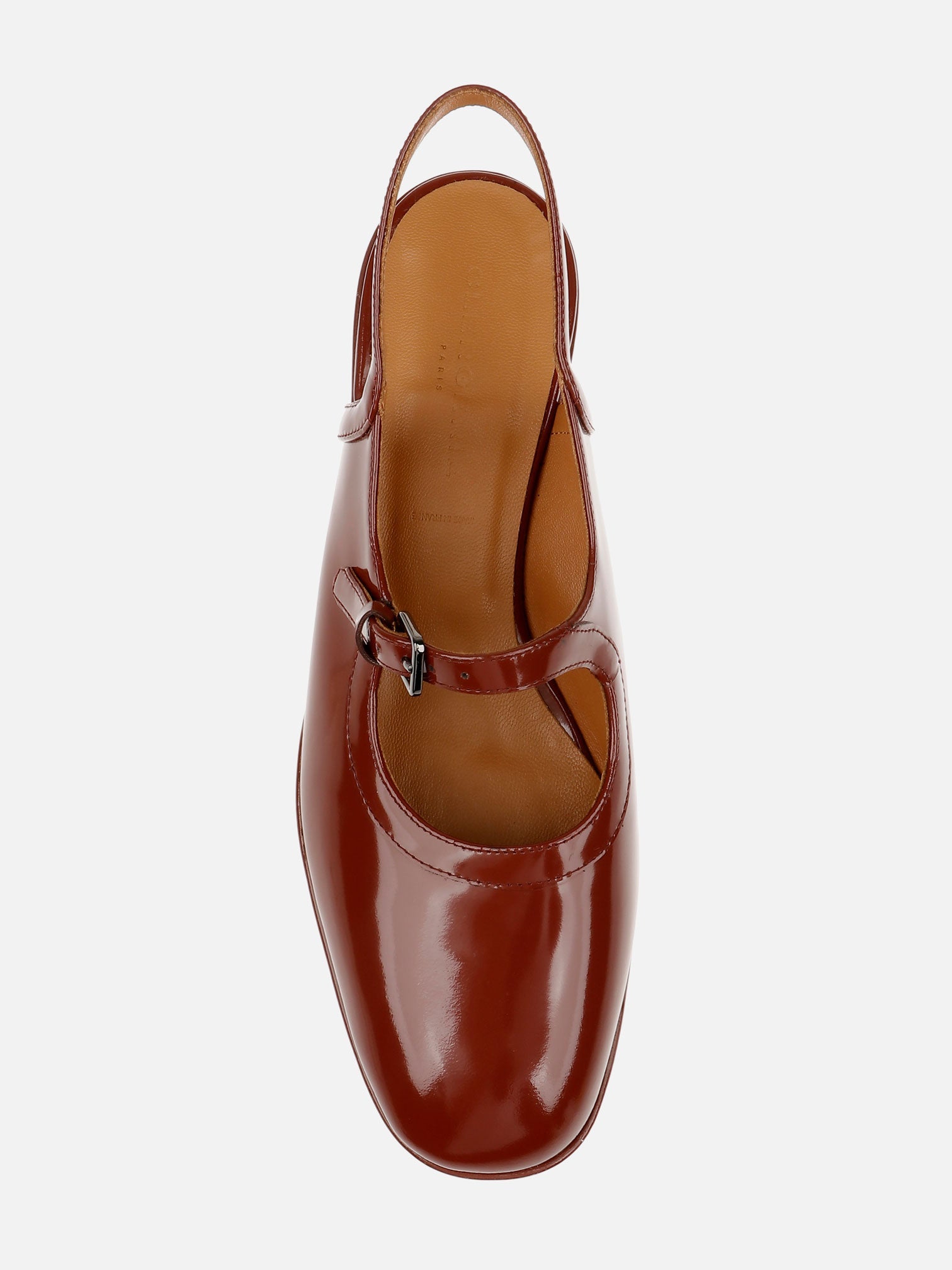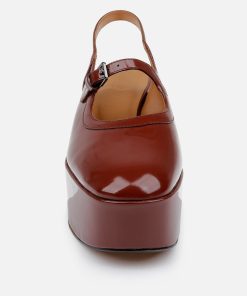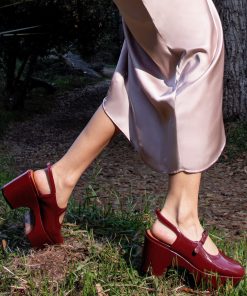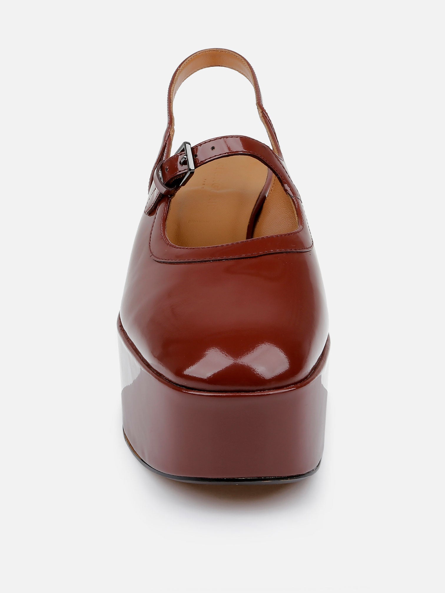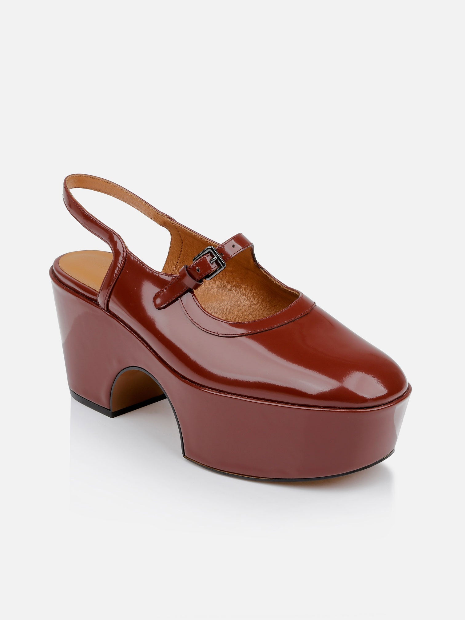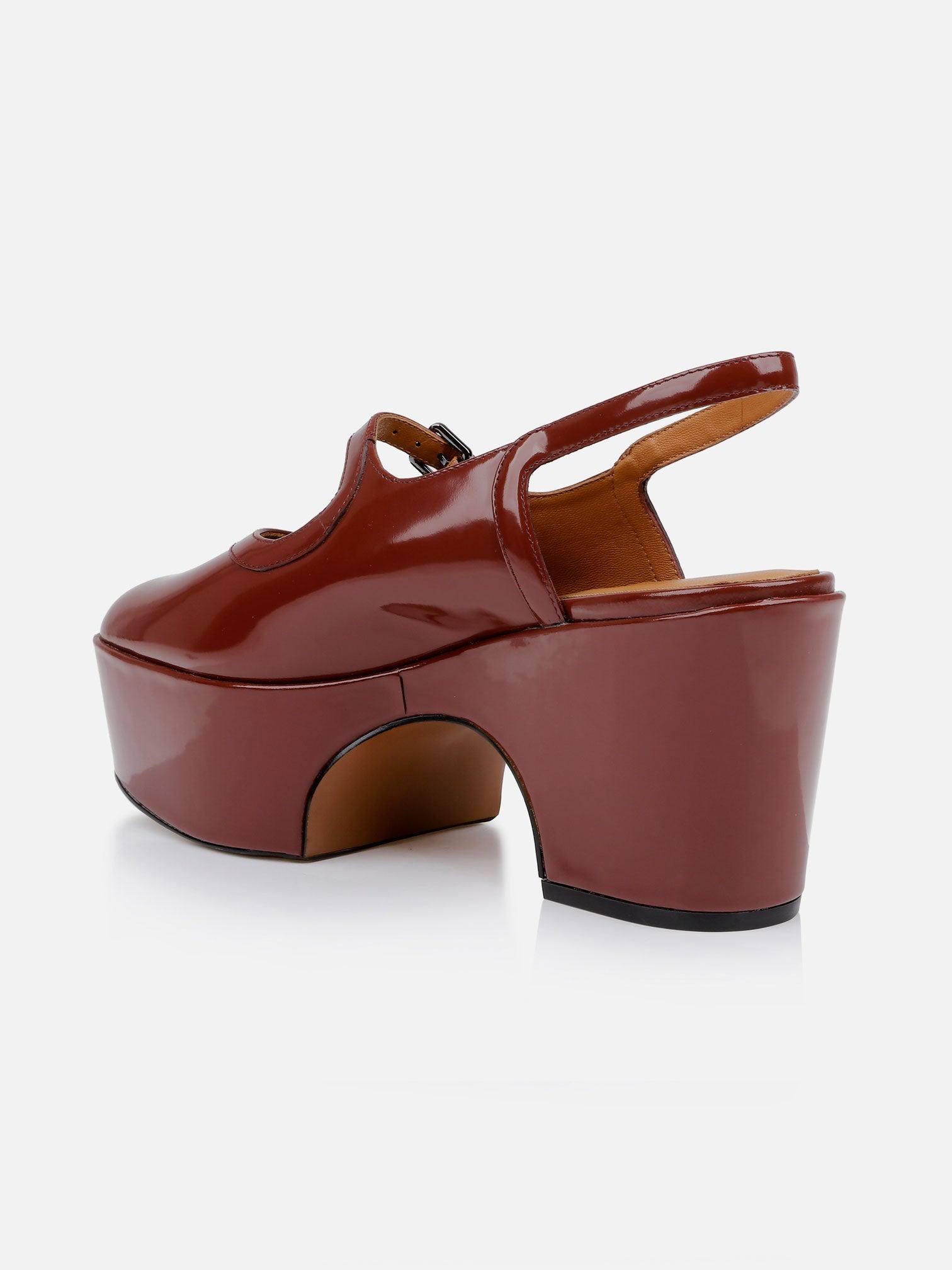 Upper: garnet glossed calfskin / Lining: gold goatskin lining / Sole: garnet glossed calfskin covered platform, amber leather sole, dark brown edge