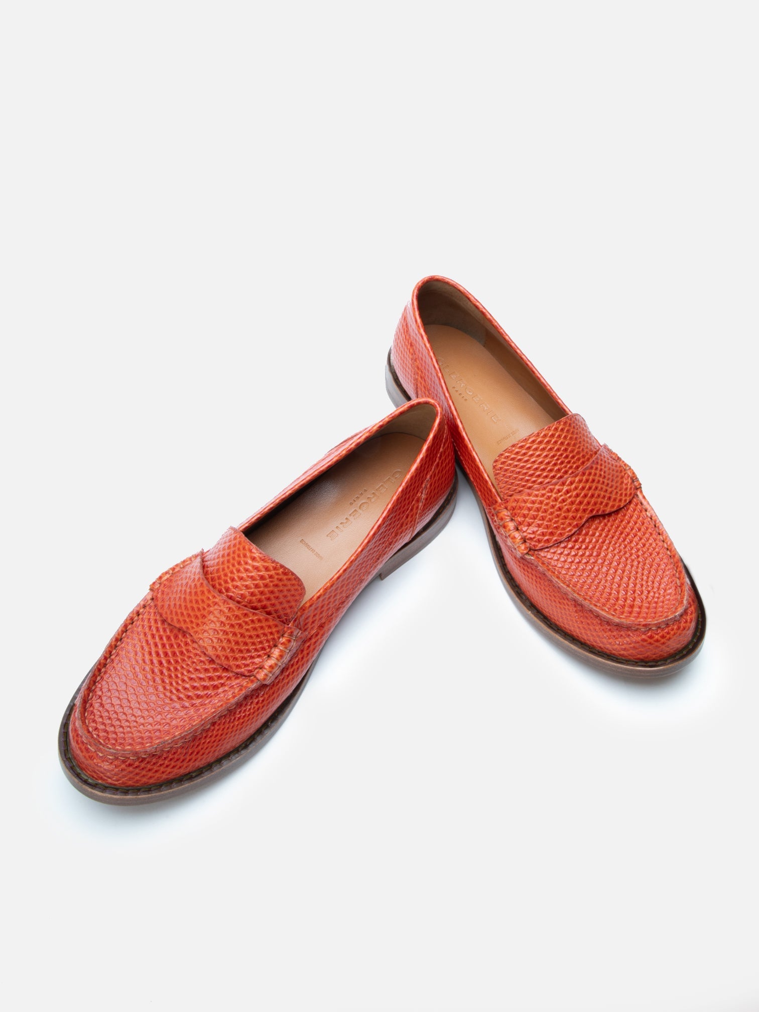 Upper: spice karung effect embossed calfskin / Lining: gold goatskin lining / Sole: amber leather sole, natural edge