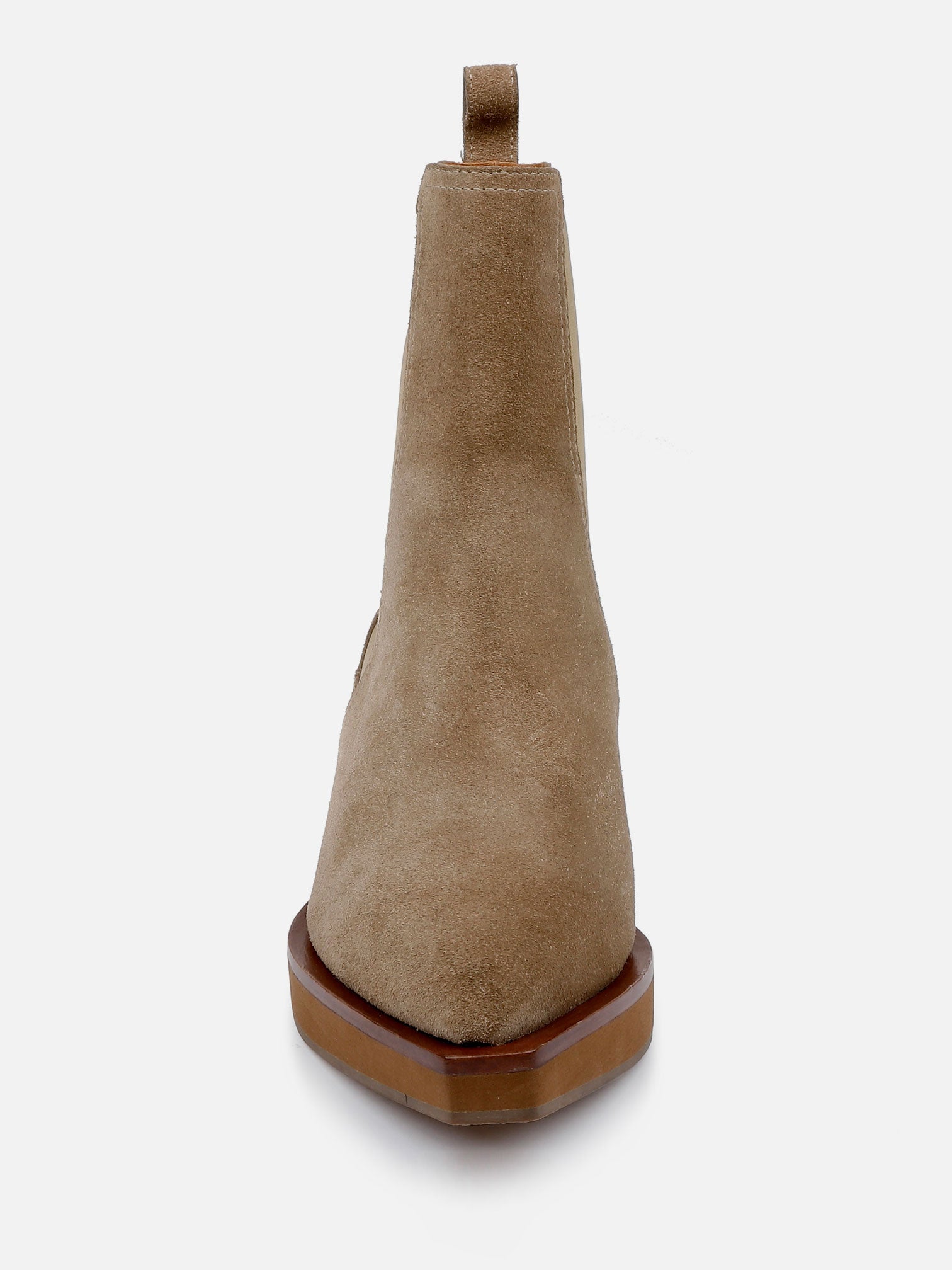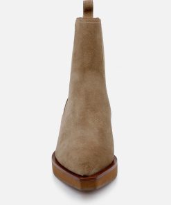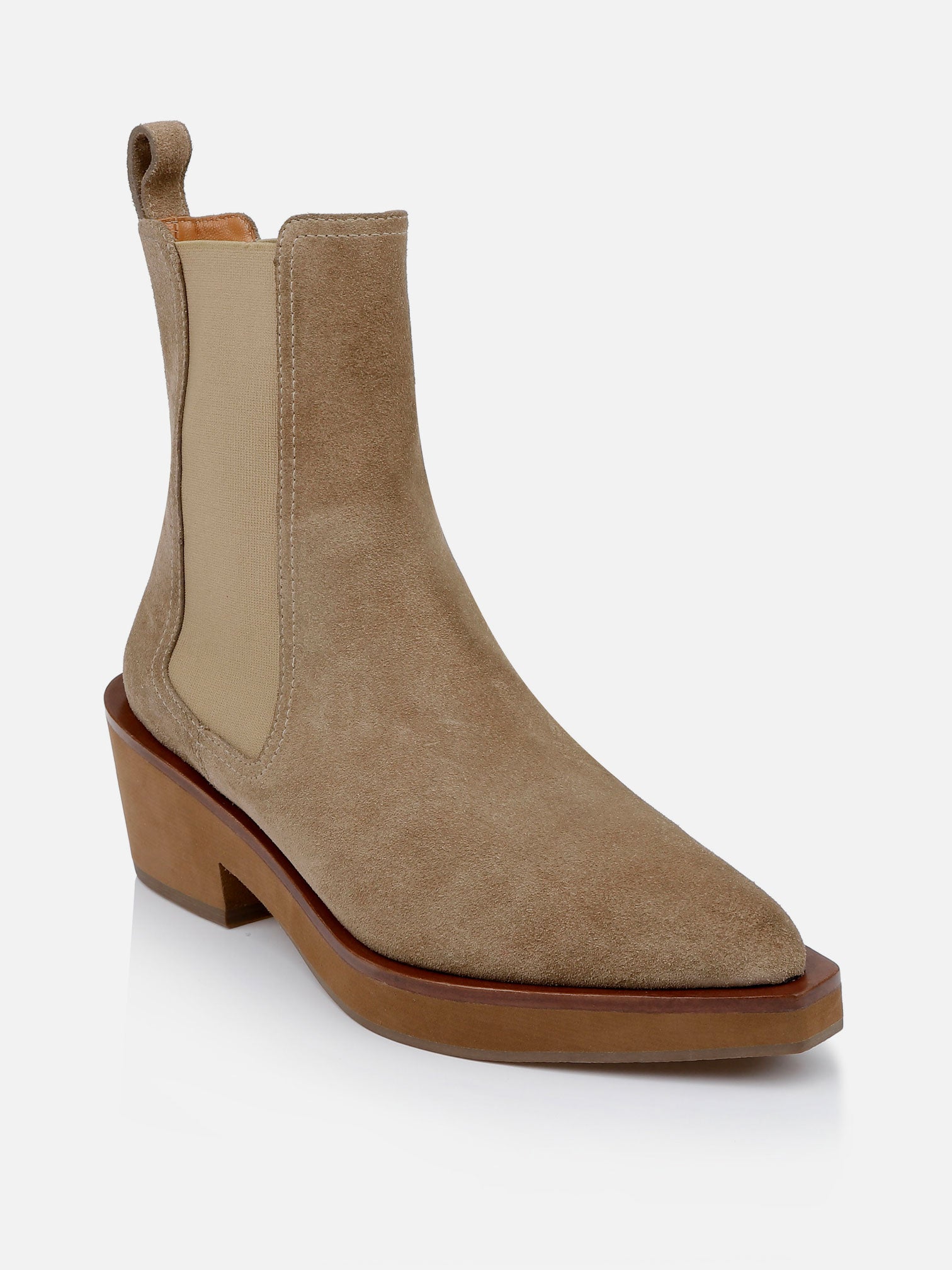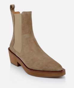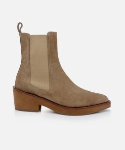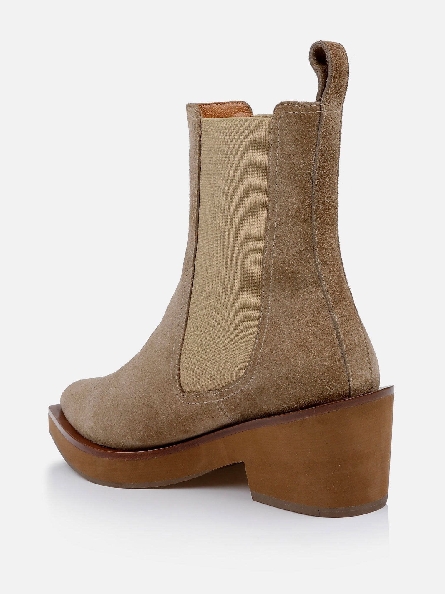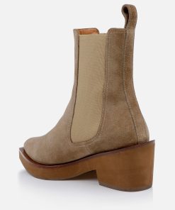 Upper: gobi suede split calfskin / Lining: gold goatskin lining / Sole: amber welt, natural EVA platform, moka sole