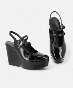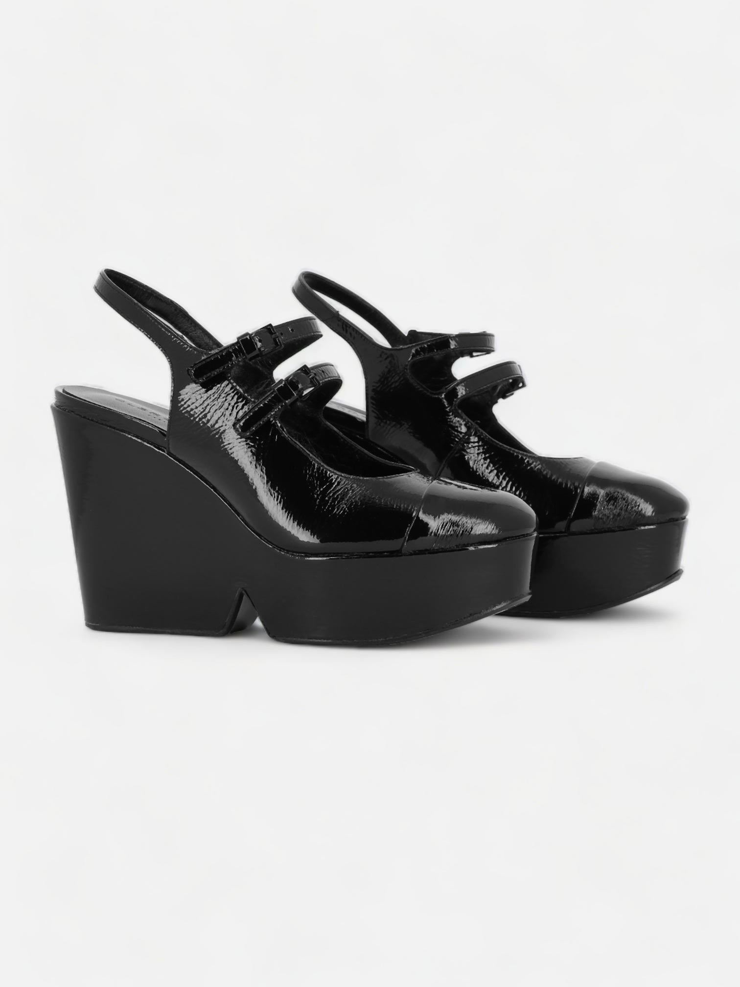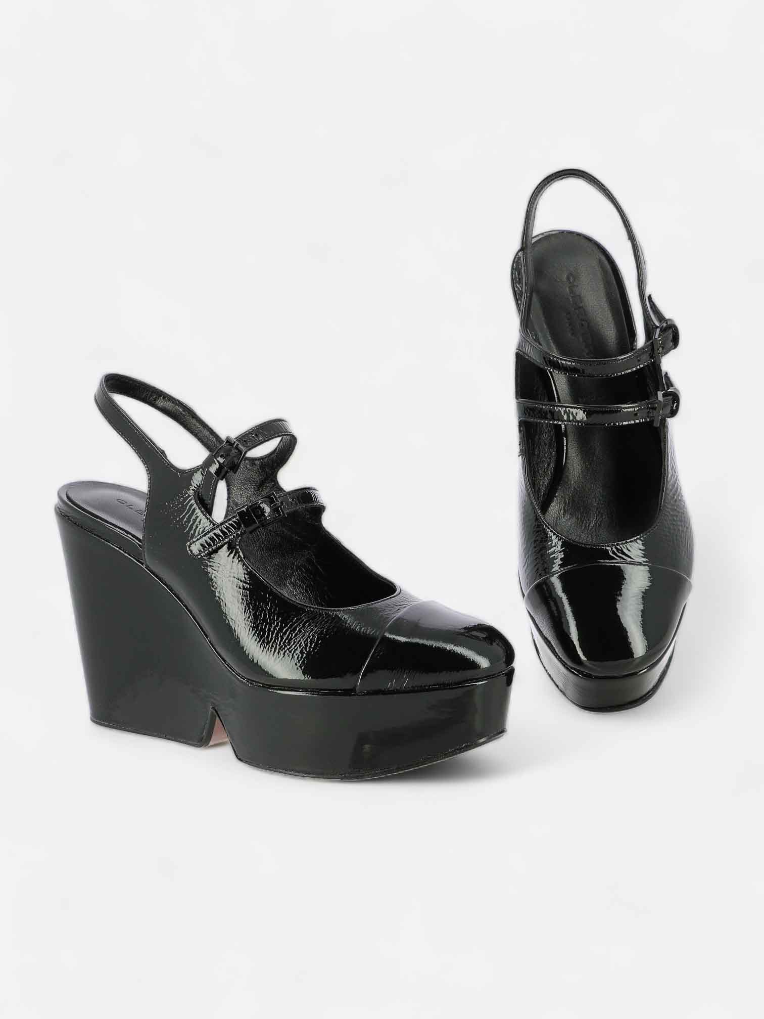 Upper: black patent goatskin / Lining: black goatskin lining / Sole: patent goatskin covered platformblack patent goatskin covered platform, arizona sole, black edge